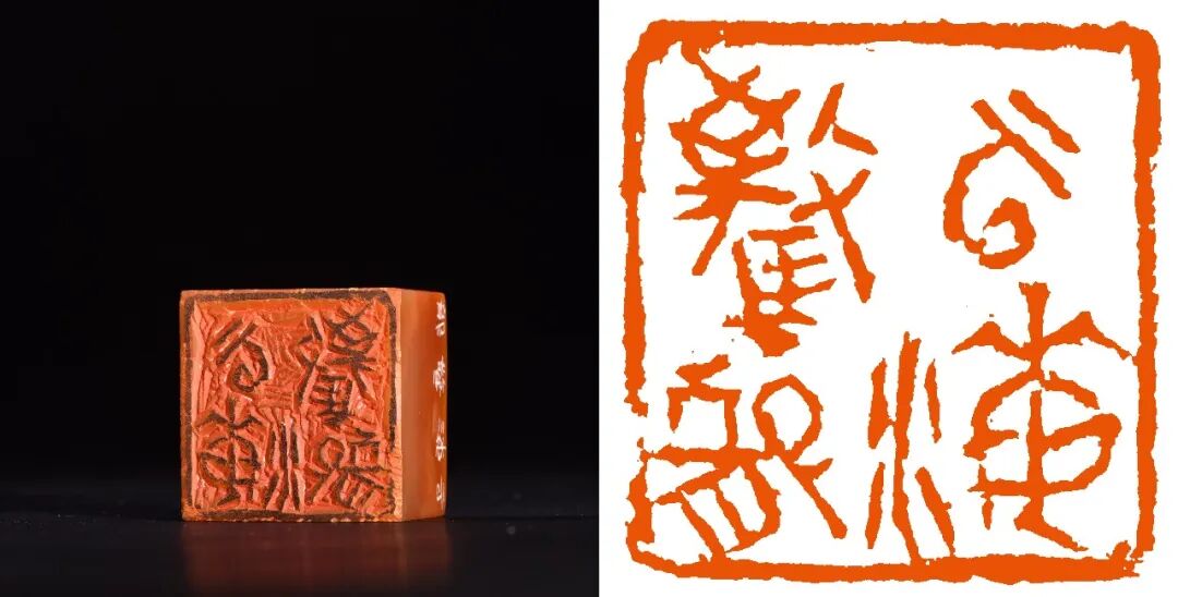 金恩楠老师的这方印是一方经典的朱文古玺风格的印章,是“2021书学之路——中国高等书法教育论坛暨篆刻专题展”的入展原作。其用刀刚猛犀利,所作线条似铜浇铁铸,如钢丝敲打,又富有金石意趣,锋刃处令人不寒而栗,敦厚处则更显几分苍茫。结字十分古拙大气,根据空间布局的需要对每个字进行了巧妙的收放处理,使得各字有不同的横纵方向体势的变化,边框的残破处理与方圆结合之态使得印章极具古趣与玩味,生动灵巧,古穆奇崛,颇有特点。印石选用了极为纯澈的青田菜花黄,附有薄意与草书边款的点缀,更为精美雅致。