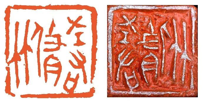 《守有威出有获》:内容出自三国时期张俨《赋犬》诗:“守则有威,出则有获。韩卢宋鹊,名书竹帛。文字造型方面主要借鉴了王子午鼎铭文和战国漆器纹饰。线条上使用了大量的细挺的弧形线条,以强烈的流动线感去营造一种神秘而优美的氛围。刻法上采用了与传统冲切刀方式不同的刻制方式,以类似于错金银的工艺性手法赋予印面华丽精巧的装饰美感。