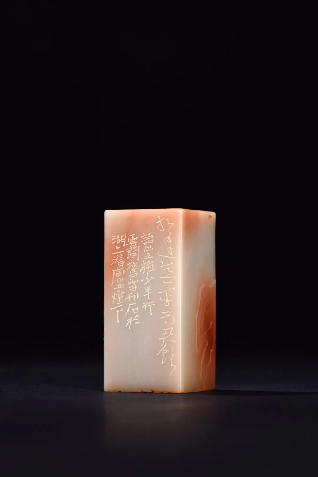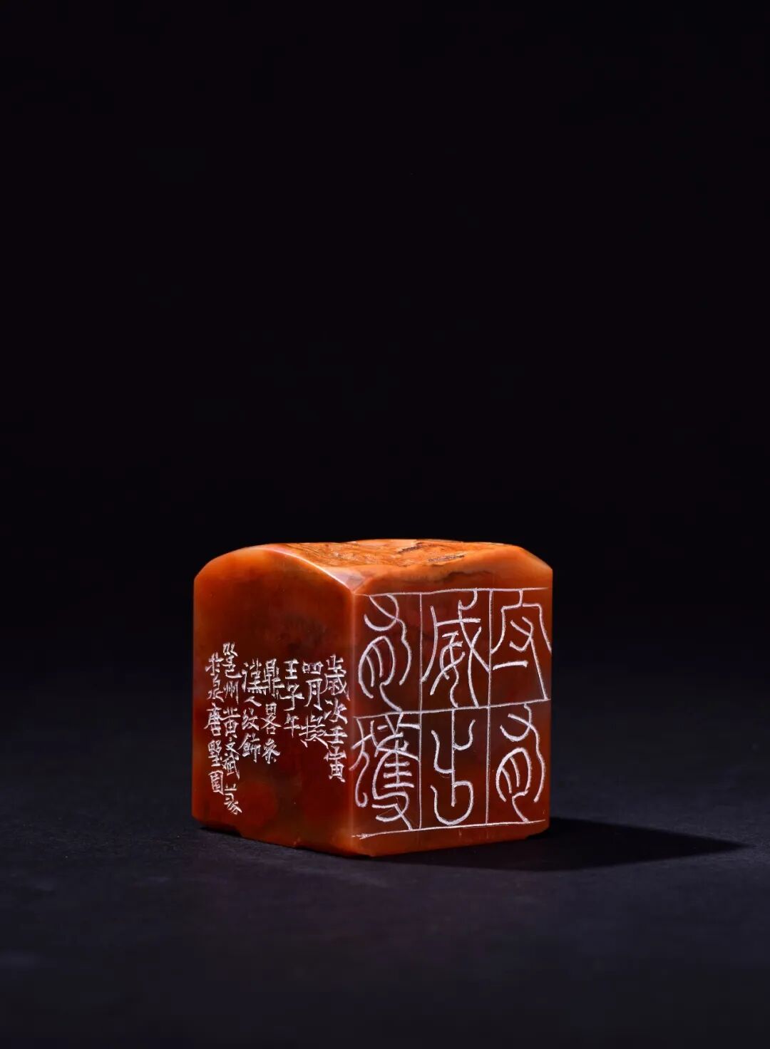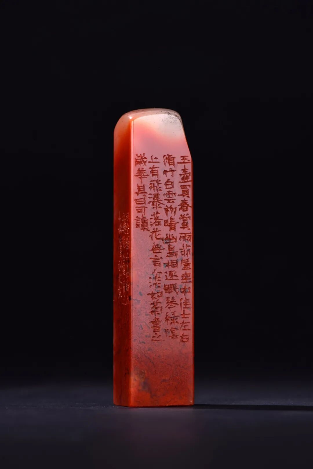 此印以三晋小玺为创作风格,气息高古。四字印易受汉印的影响均匀排布,所以在文字整体排列上做了一个211的排列方式,从而避免了板正,增强了古玺的流动和空灵。单字线条以均匀为主,力求细致而挺拔,增强力量感。线条交接处既有封泥似的“焊接点”,又有锋利的“刀感”,使其既见书写感又见刀刻感,将书写与金石味完美融合在一起。边框处理见巧思,用中锋线条搭接,有一种圆厚的立体感,残破处与文字疏密相互呼应,使得密处能透气,疏朗处能聚气。文字与边框有两处连接,左边与“竹”字重笔处似连非连,下边与“右”字“口”部相连,两处遥相呼应,相互顾盼,使边框与文字建立联系,融为整体。文字内容为司空图《二十四诗品之典雅》,印风与内容契合。边款楷书刻出《二十四诗品之典雅》全文,三行小款错落排列,宛如一幅完整的书法作品,庄重而静雅。印石为一枚老挝水洞桃花,玻璃地,通体结晶红艳,是不可多得的佳料。印身水润透亮,桃花颗粒饱满,宛如清澈的水中点入朱砂缓缓化开模样。