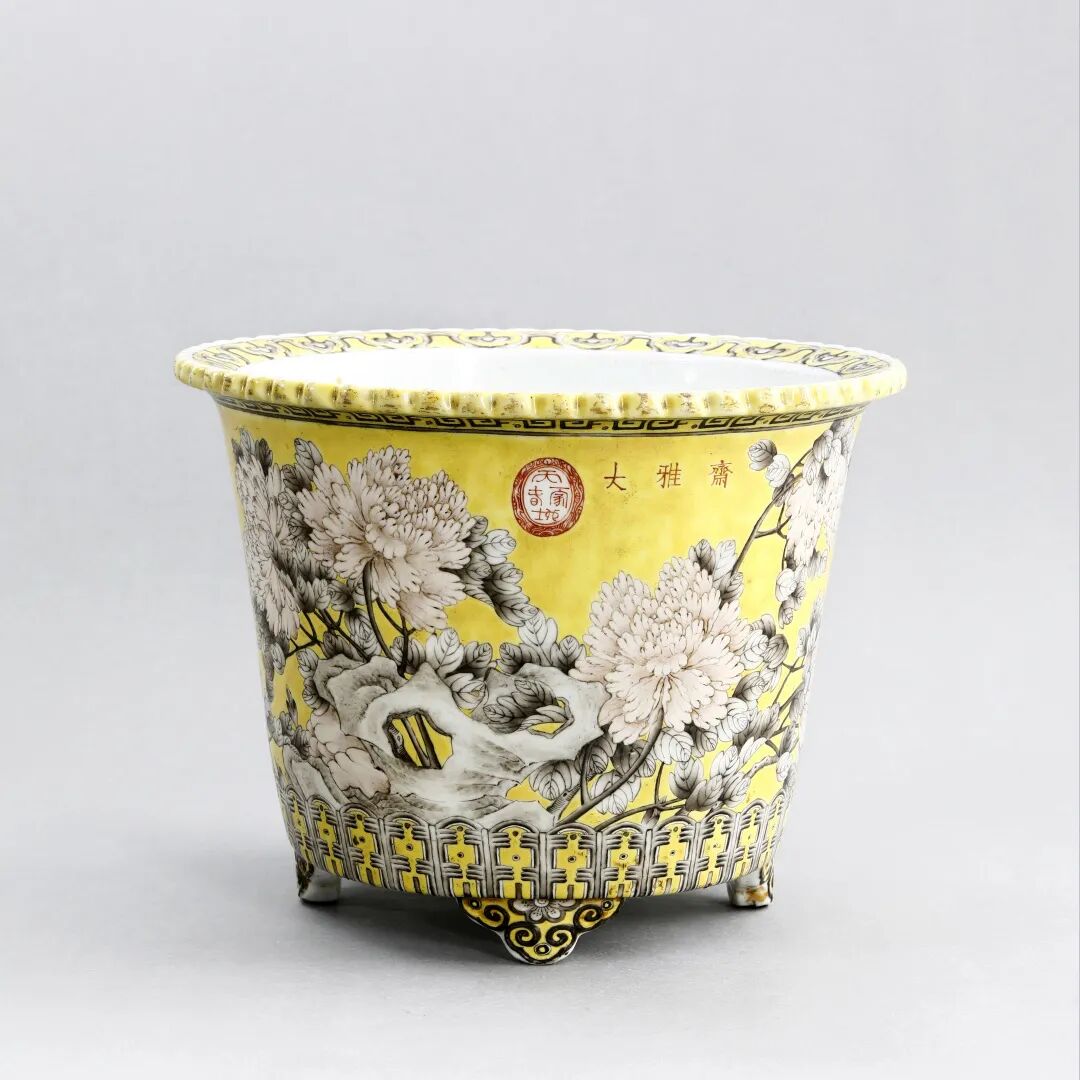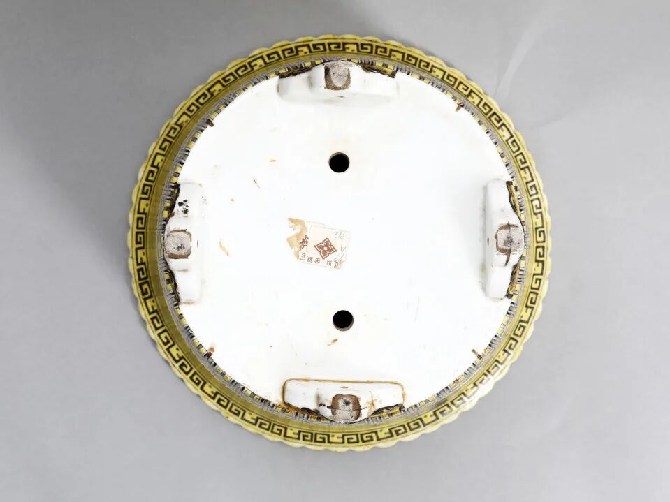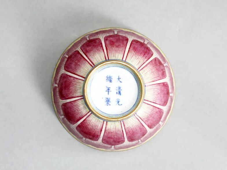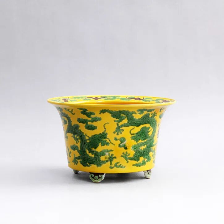 另有御窑烧造之不俗雅品,如241号清乾隆洋彩福庆有余双耳小扁瓶,器形小巧,隽秀典雅,以小器而见大样。243号清嘉庆黄地绿彩云龙纹花盆为御窑厂烧造进贡宫廷使用,花盆以黄、绿、赭三色装饰,在传统官样的基础上又别处心裁,龙纹威猛生风,整器观之大气端庄。247号清光绪粉彩莲瓣纹碗形制为乾隆首创,全器仰覆莲相互映衬,然以细腻技法描绘莲瓣筋脉,甚为精巧,尽显皇家宫廷气派。