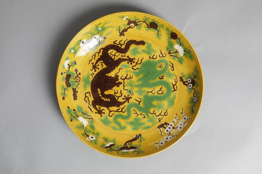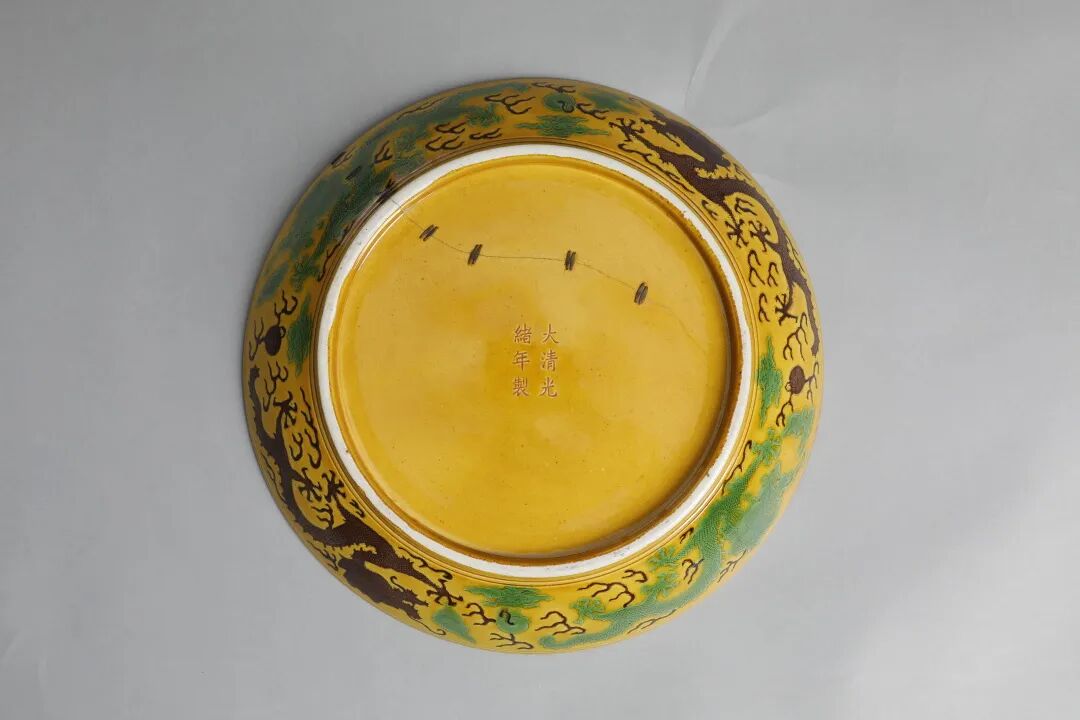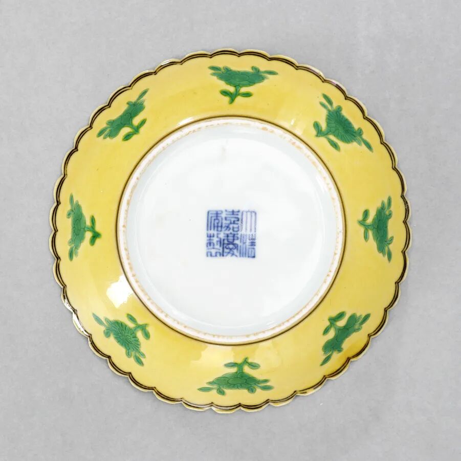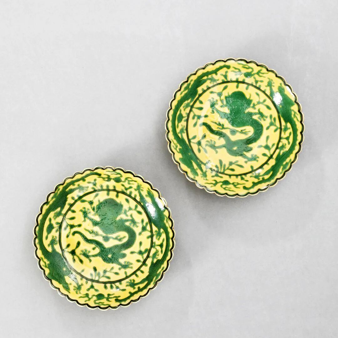 清嘉庆 黄地绿彩龙纹花口碟成对