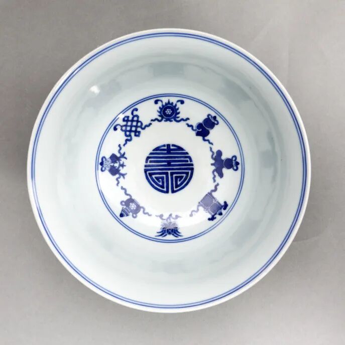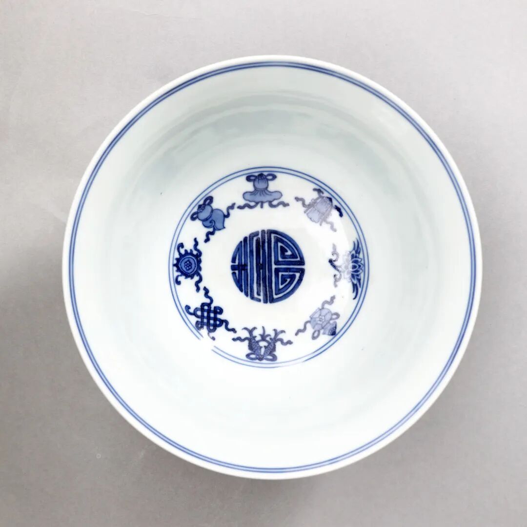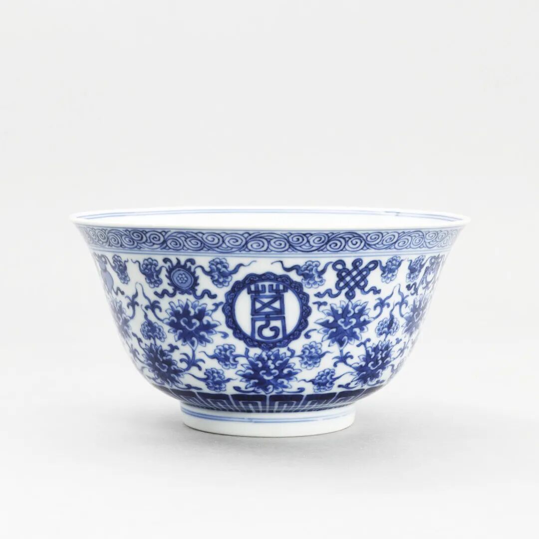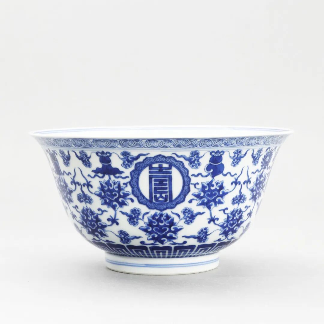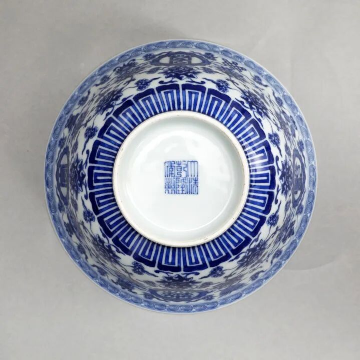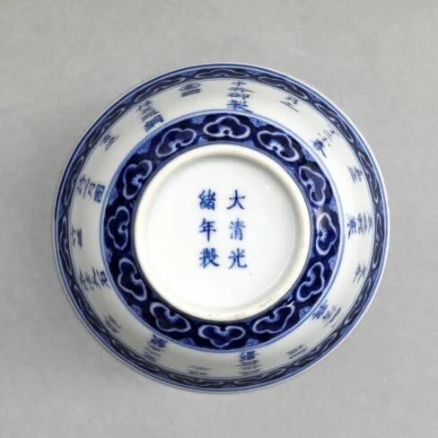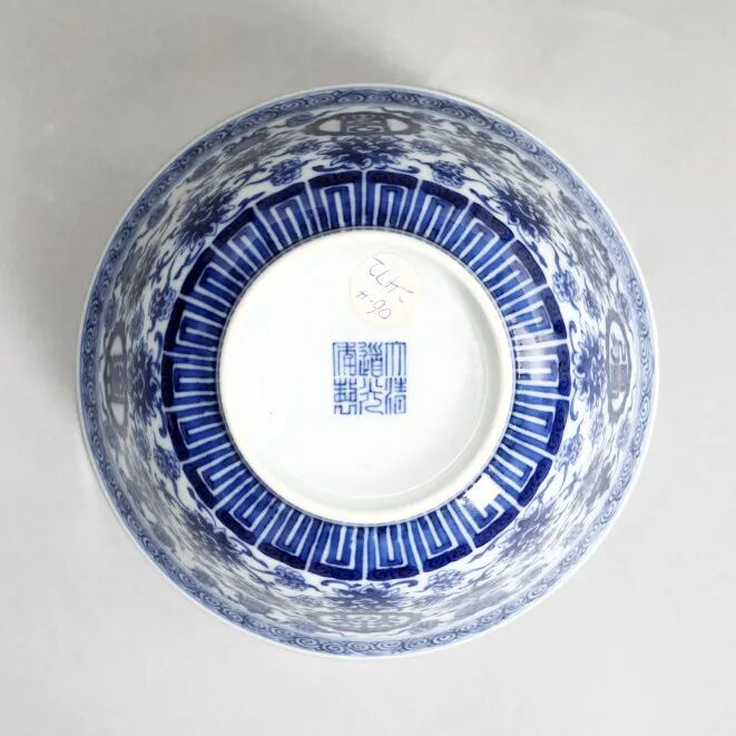 款识:“大清道光年制”六字三行篆书款青花万寿无疆纹碗 D:18.3cmH:9.4cm