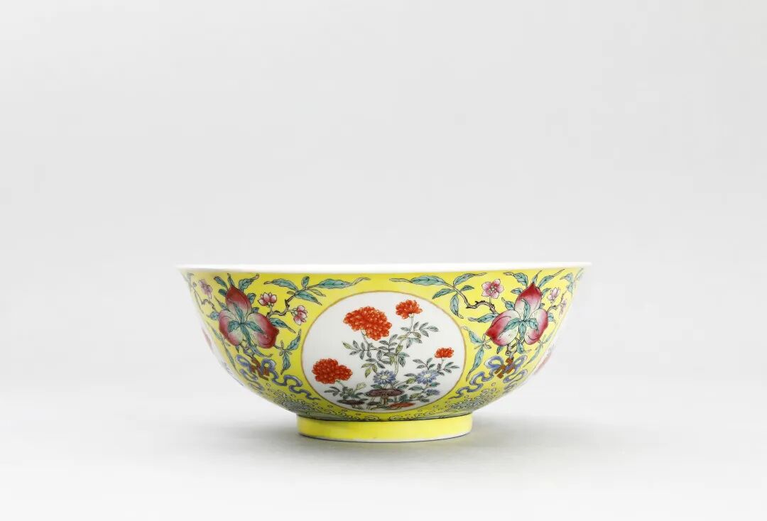 清嘉庆 黄地万寿开光四季花卉纹碗