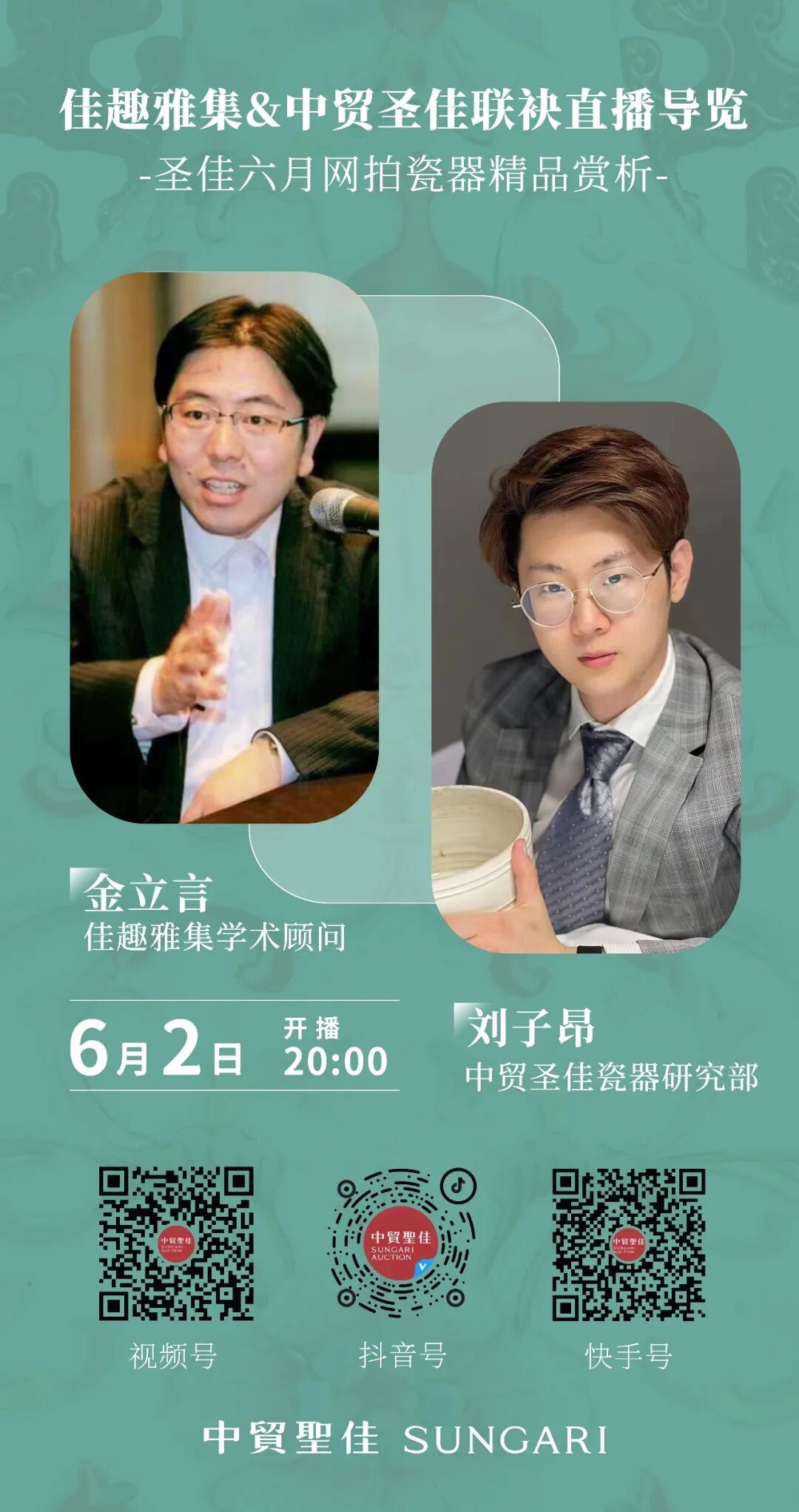 6月2日 20:00,佳趣雅集与中贸圣佳联袂开启圣佳六月网拍瓷器直播鉴赏!本次直播邀请到佳趣雅集学术顾问金立言老师做客直播间,与中贸圣佳瓷器研究部刘子昂一起,为各位藏家朋友带来本次网拍瓷器板块直播鉴赏,赶快扫描下方二维码锁定直播间,精彩不容错过!