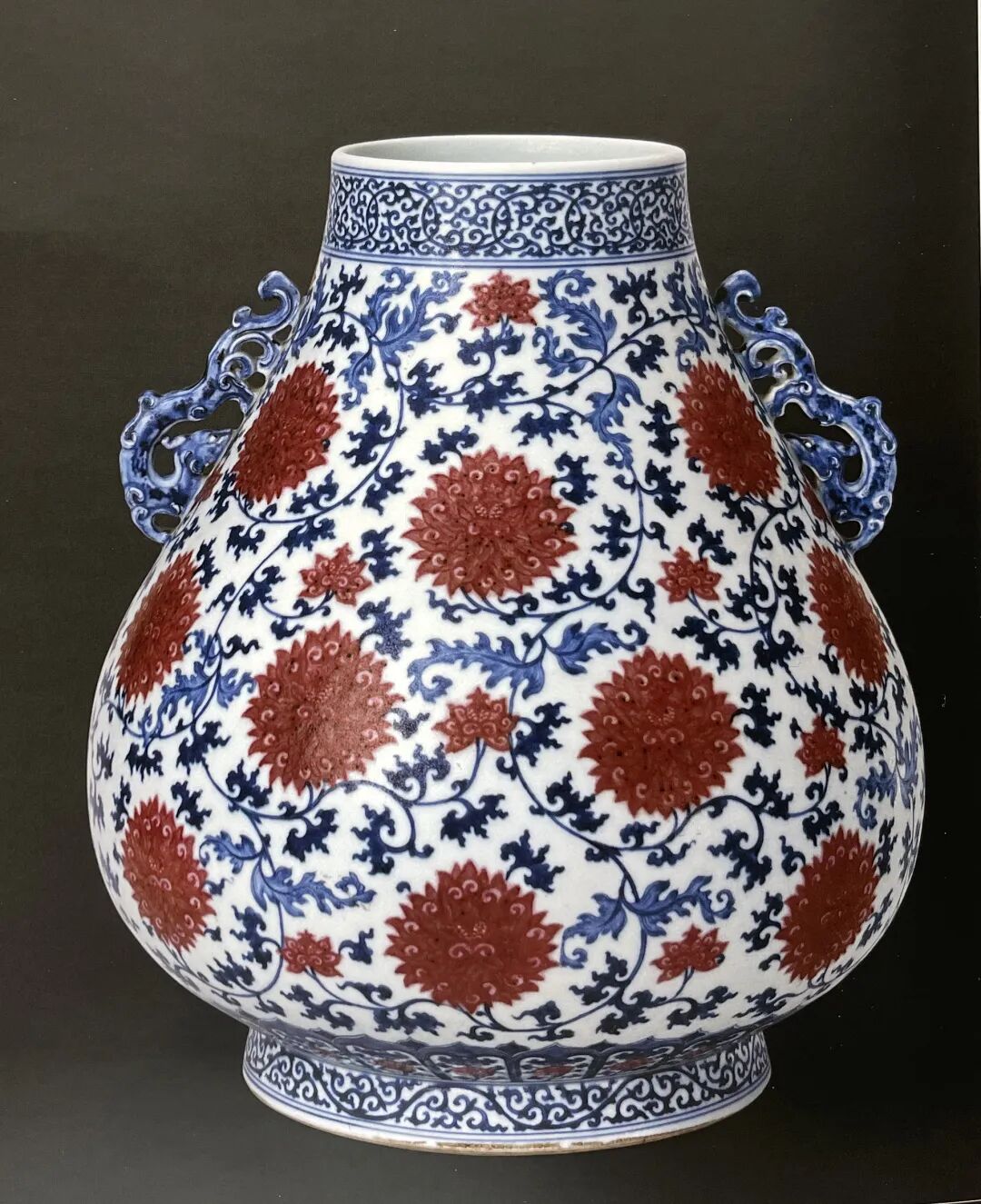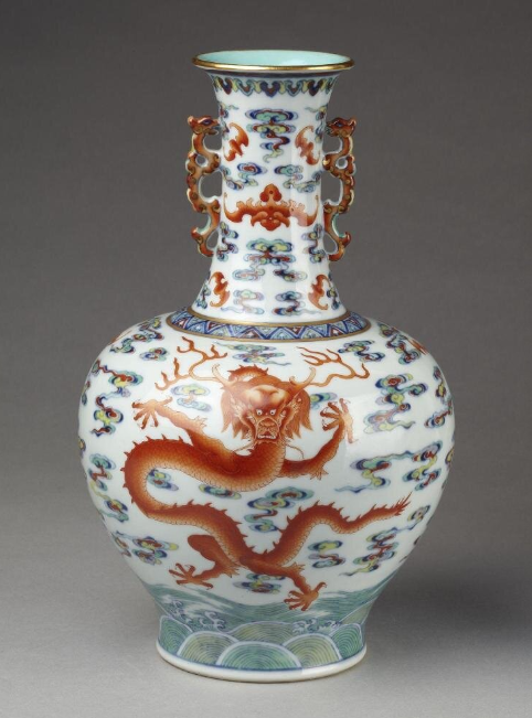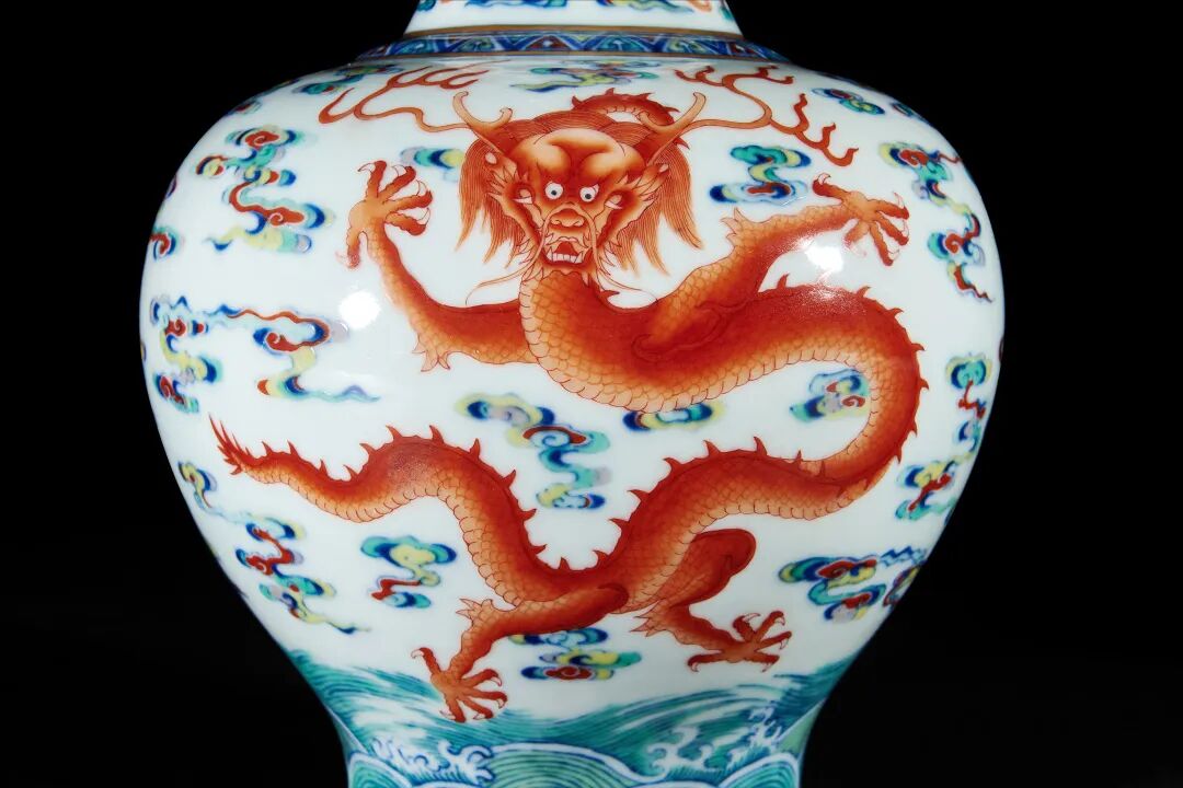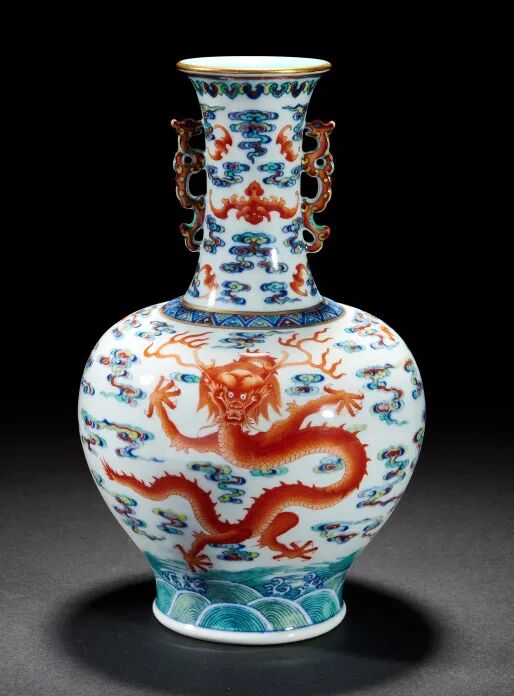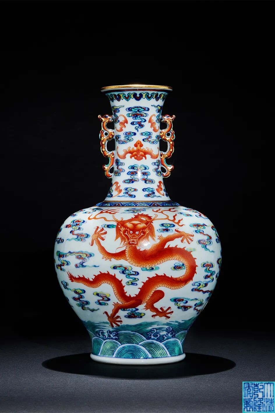 瓶身经二次烧制,先烧制青花勾线,二次入窑烧制粉彩及矾红,矾红色泽鲜妍厚润,色阶过渡自然,烧制温度掌握恰到好处,如西洋画般有暗影效果,配合其他以斗彩绘制而成的图案及适当的留白,更显整体纹饰和谐平衡。青花线条幼细,彩料填色精准,细节犹一丝不苟。立体的螭龙耳与腹身龙纹主题互相呼应,器身龙纹充分显现出庄严大度之皇室气派。龙素来是中国皇权的象徵,历代众多君主中,乾隆皇帝尤好龙,以之彰显其威名显赫的宏图大业。清宫瓷匠为迎合乾隆皇帝之奢华品味,额外加绘繁复的瑞云和蝙蝠图案,为作品增添吉祥瑞意。