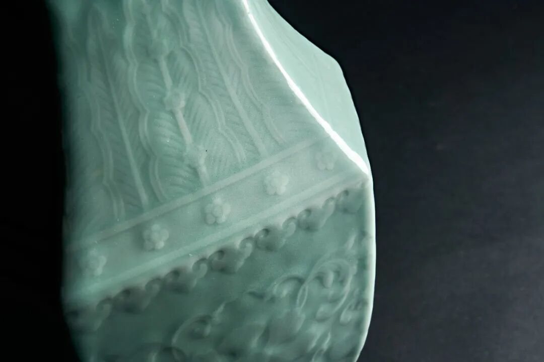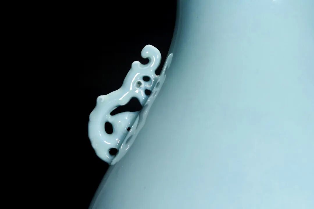 其中口沿及双耳所雕饰之夔龙工绝殊常,反映了当时廷艺匠水平之高。减地起阳式的图案与媚人的粉青釉融为一体,雕缠枝莲花、夔龙形象隐现于釉层当中。此式釉下模印、浅浮雕工艺清宫旧称“拱花”,为粉青、冬青釉等摹仿龙泉瓷器唯一使用的装饰手法。在清宫陈设档与乾隆早期造办处活计文件的记录中早已见有相关记载。