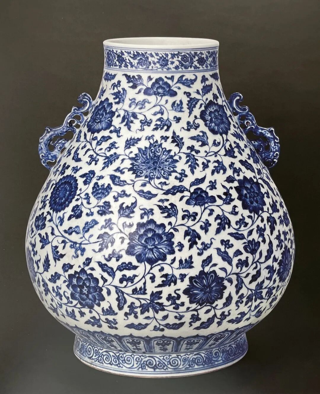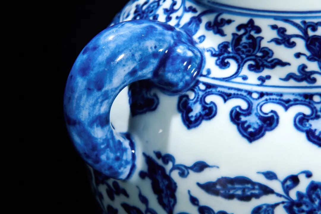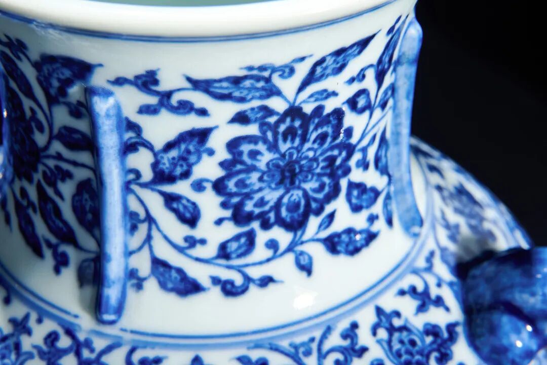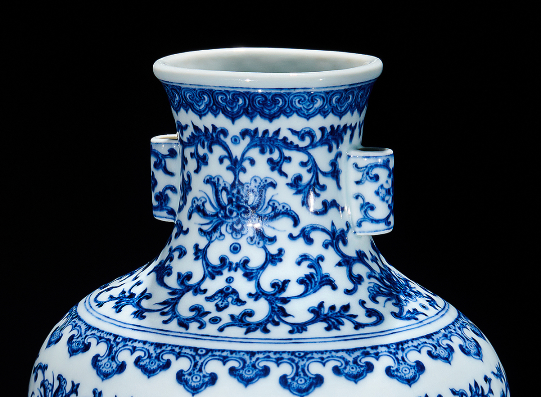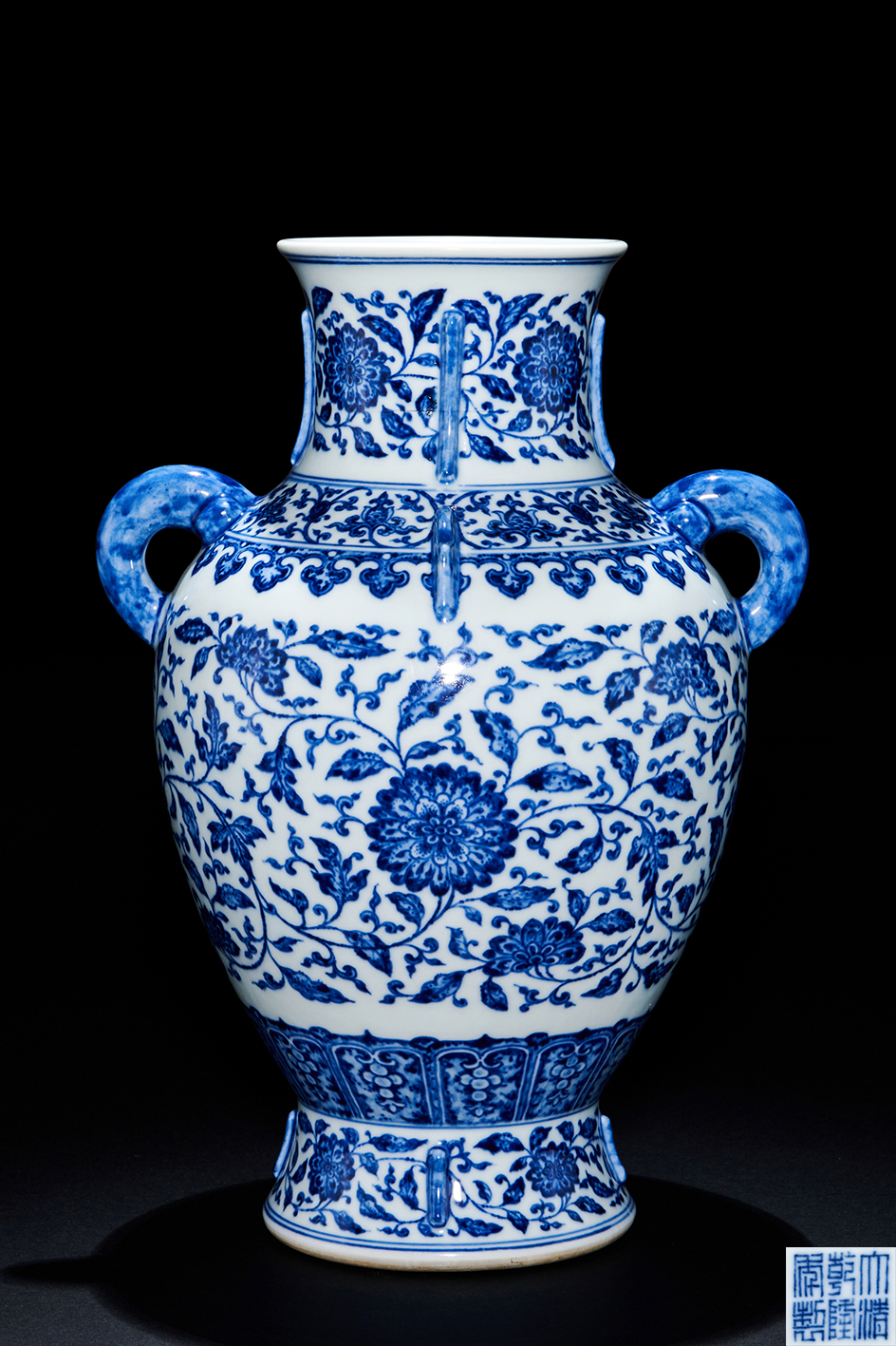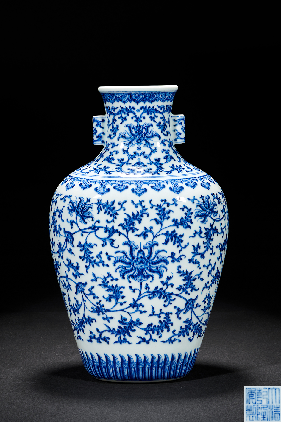 本品以青铜罍作为原形,可考国立故宫博物院藏商至西周时期兽面纹罍,是典型的乾隆仿古创新之作。观其青花发色,浓艳而不炫目,秀敛亦不蒙滞,浓淡相宜,层次宛然,别有一番清雅韵致。釉汁莹白坚致,与青花相衬,愈珍乎妙境,审其形制、釉色、纹饰、画工之精美,确其为清乾隆时重要宫廷陈设,应为乾隆早期官窑青花精品。