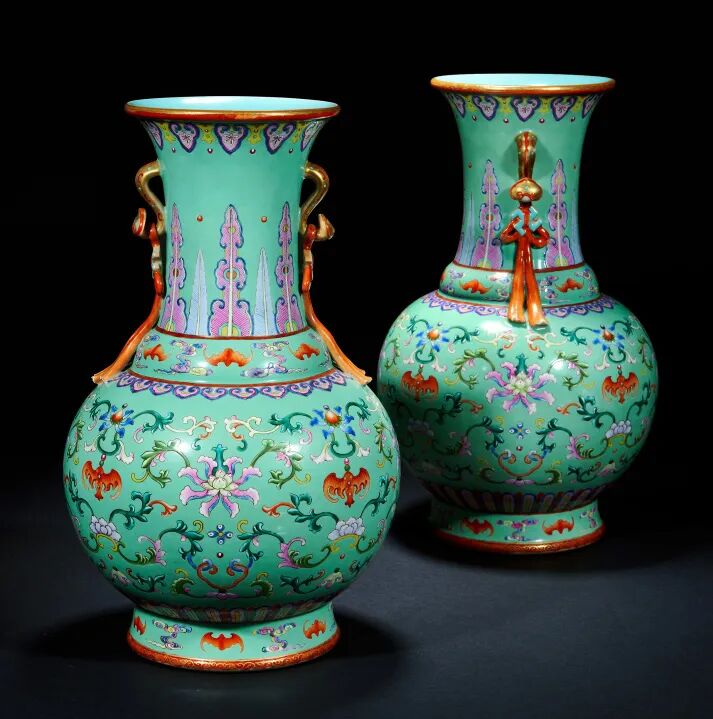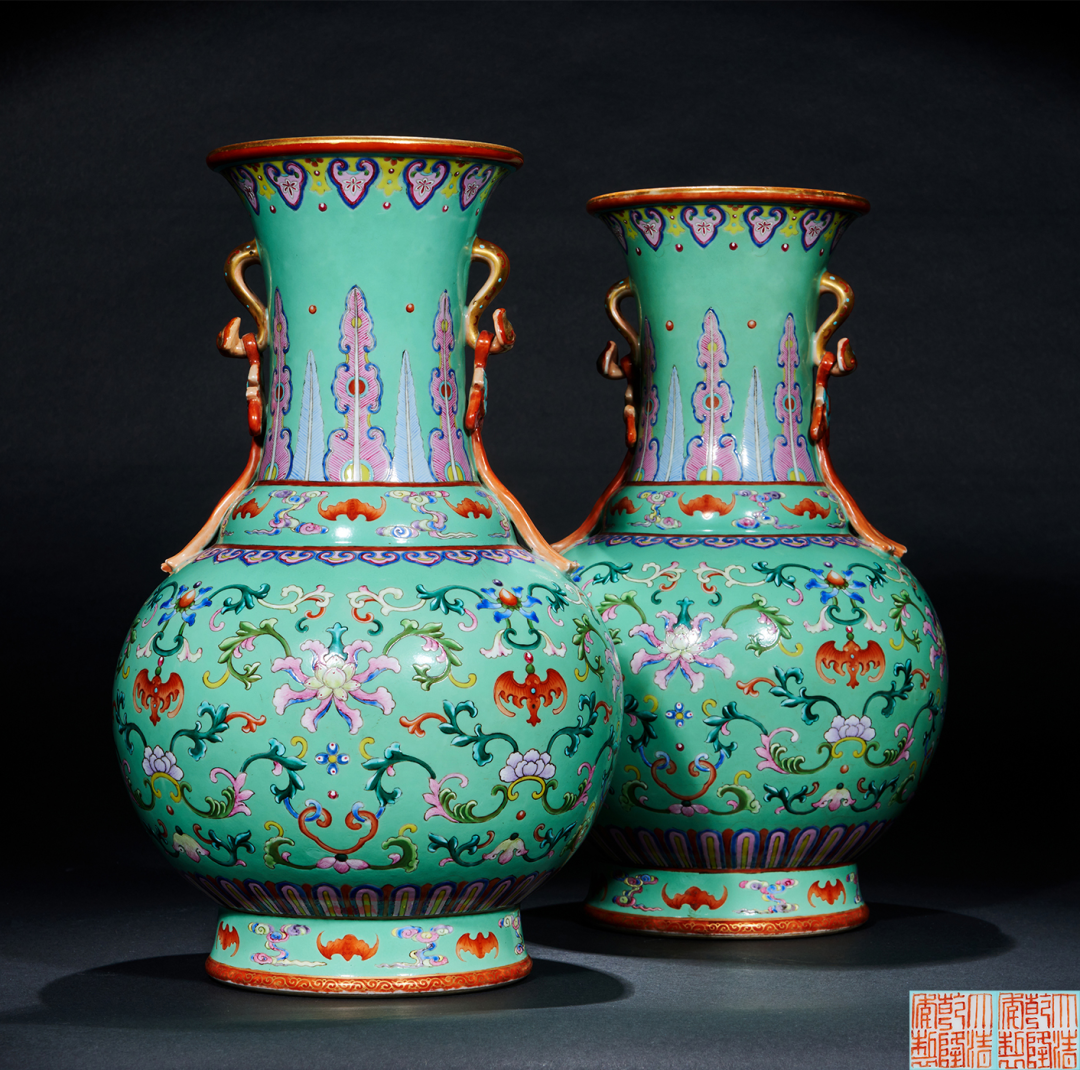 清乾隆 嫩绿地粉彩“如意万寿”图缠枝莲纹如意绶带耳瓶(一对)