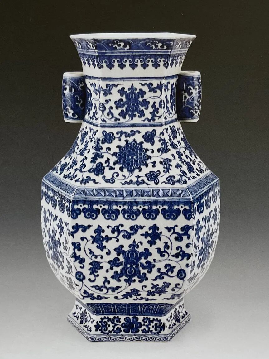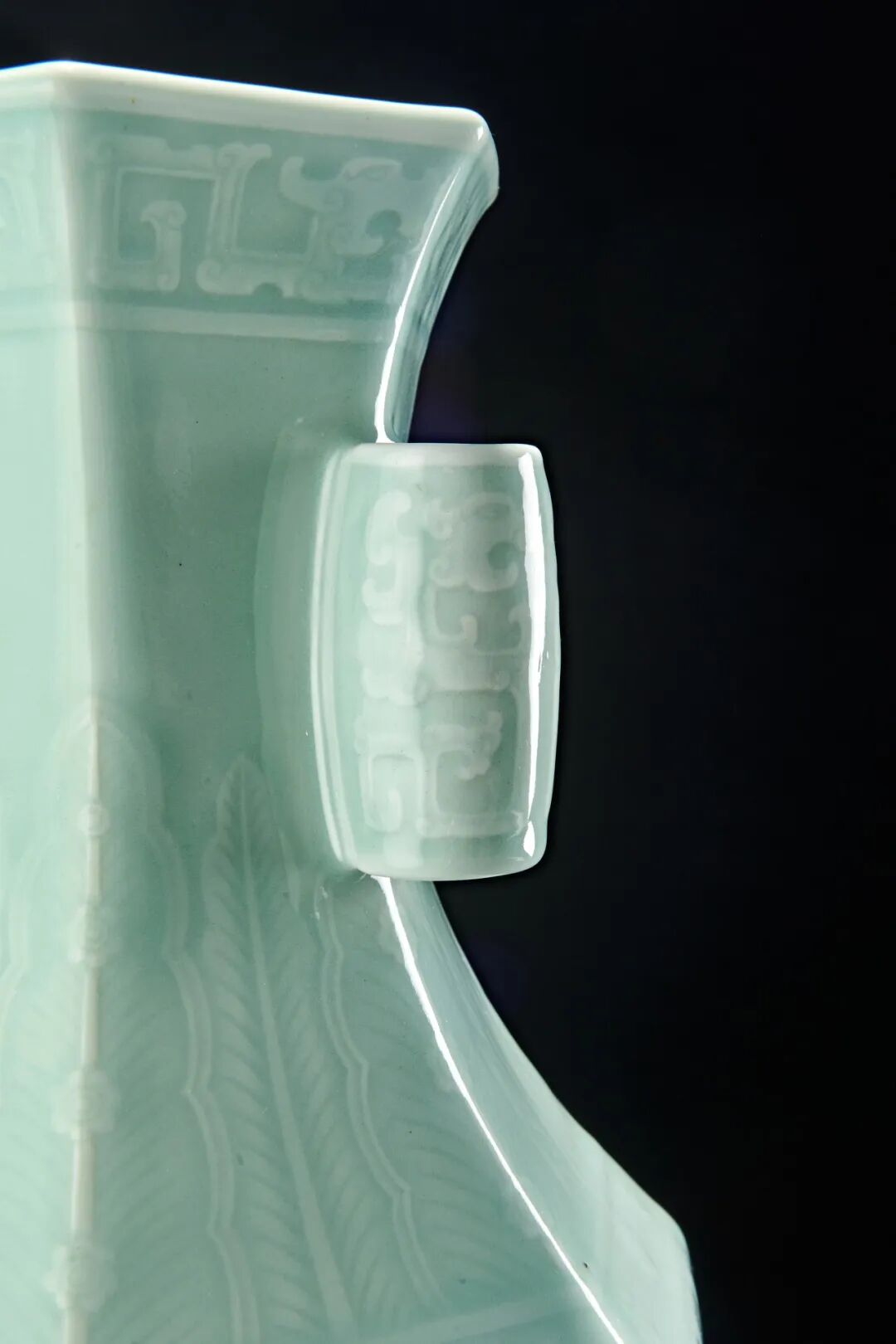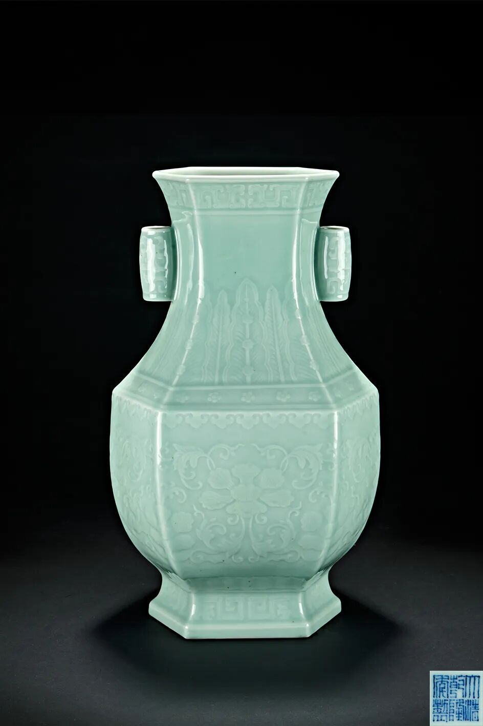 本品以粉青淡恬之柔美配饰六方硬朗之造型,实收刚柔相济之妙,可见设计者独具匠心。此式造型清宫旧称为“双管六方瓶”,最早见于雍正御窑,凝聚了胤禛超乎常人的审美品味。至乾隆一朝加以发展,见青花之例,现藏于北京故宫博物院。