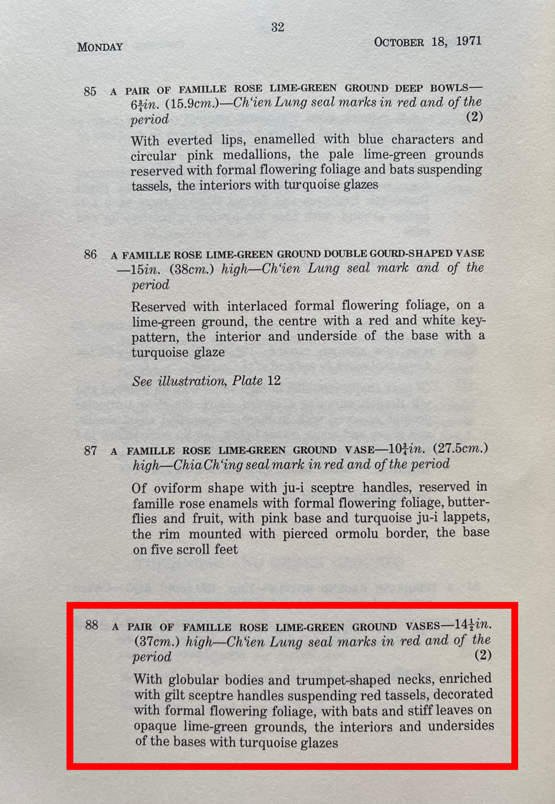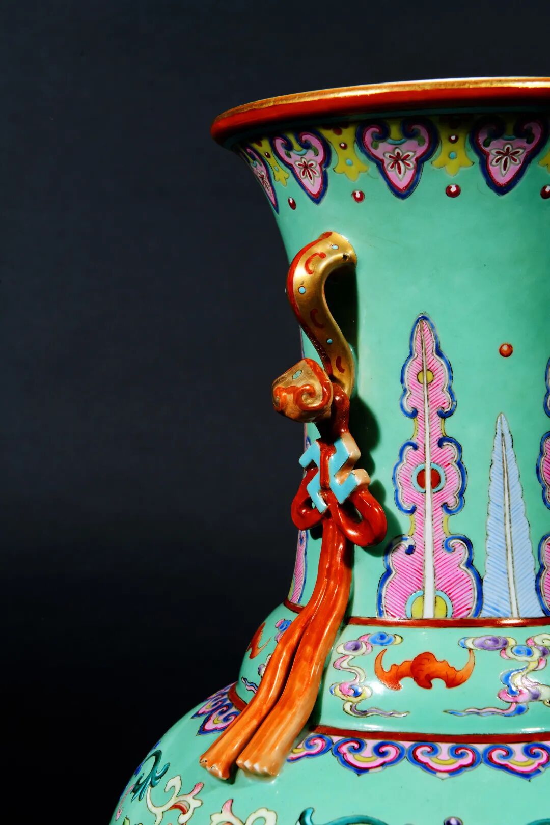本品为乾隆官窑之中堪称别致的彩绘佳器,其形尊贵典雅,装饰雍容华丽,颈部双如意耳精巧细致,金彩如意底下有一松石绿彩“卍”字吊饰,所系的红色绶带生动飘逸,寓意“如意万寿”,为乾隆御窑瓷器的一大特色。整器仿制掐丝珐琅,以绿彩作地,各处图案以粉彩、金彩、矾红填饰而成。其口微外侈,口沿装饰如意云头纹,间饰圆形光点装饰,颈部饰蕉叶纹,大小相间,蕉叶轮廓像如意形般起伏,设计别出心裁。