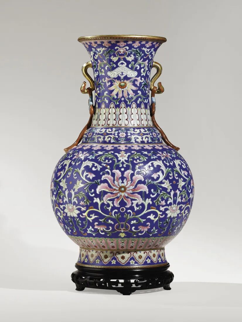 清乾隆 御制宝石蓝地洋彩莲花如意万代尊