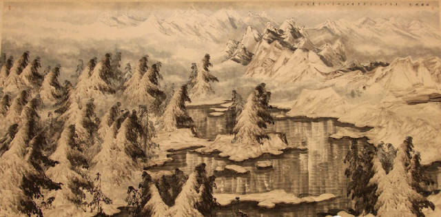 作者于志学,1935年生于黑龙江肇东市,冰雪山水画创始人,作品质朴、粗犷、沉雄,力显关东山水的阳刚之美,作于2009年。