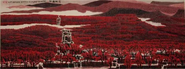 于是他中断了写生,匆匆赶到南京家里,才知道周恩来总理和陈毅等人点将,要他为人民大会堂创作一幅巨制迎接建国10周年,合作者是岭南派的关山月。而画幅之大在中国绘画史上也不多见,宽9米、高5.5米。