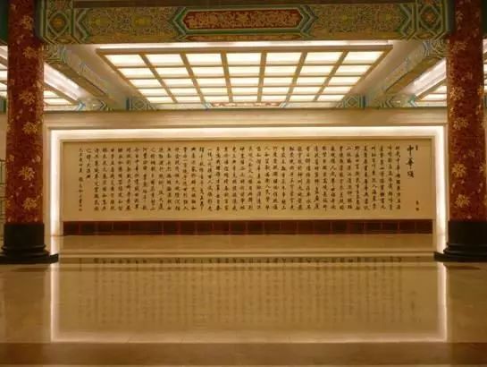 这幅巨作镶嵌于人民大会堂中央大厅中央金色大厅内,得到国家领导人的充分肯定。《中华颂》此幅书法巨作长18米、高3.72米,每字径尺,书艺焕彩、顽铁生辉,规模空前,堪称绝品。