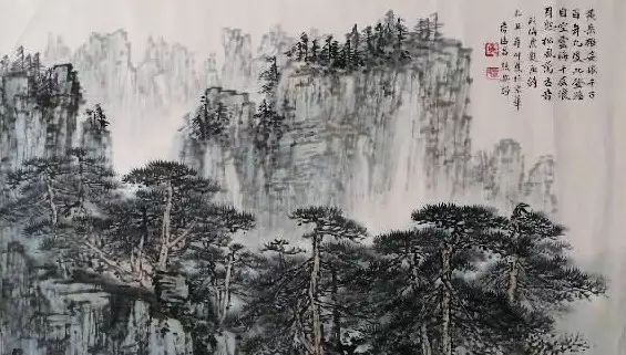 这幅巨幅国画气势磅礴,笔墨酣畅淋漓;山石奇绝跌宕;青松巍然林立;浑厚雄强、生动清新,一派大家气象,18年来一直悬挂在人民大会堂东大厅。《幽燕金秋图》几乎每晚都会出现在中央电视台《新闻联播》中,是央视出镜率最高的一幅山水画作品。