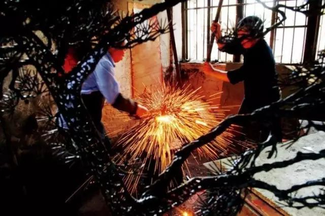 当年,没有电焊机,全部是通过手工,一根一根锻打出来,然后加工成松花、松枝,耗费的工时不计其数,真可谓千锤百炼。在连接主枝干的时候,工人将刚刚从炉里烧红的枝干趁热合成在一起,持续的时间只有几秒钟,需要多人配合,步调一致。