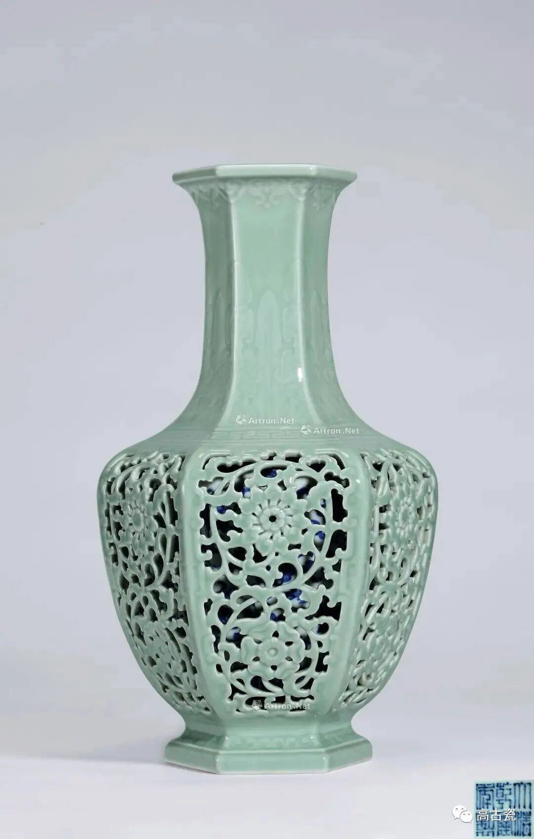 NO.6 清乾隆 外粉青釉浮雕芭蕉叶镂空缠枝花卉纹内青花六方套瓶