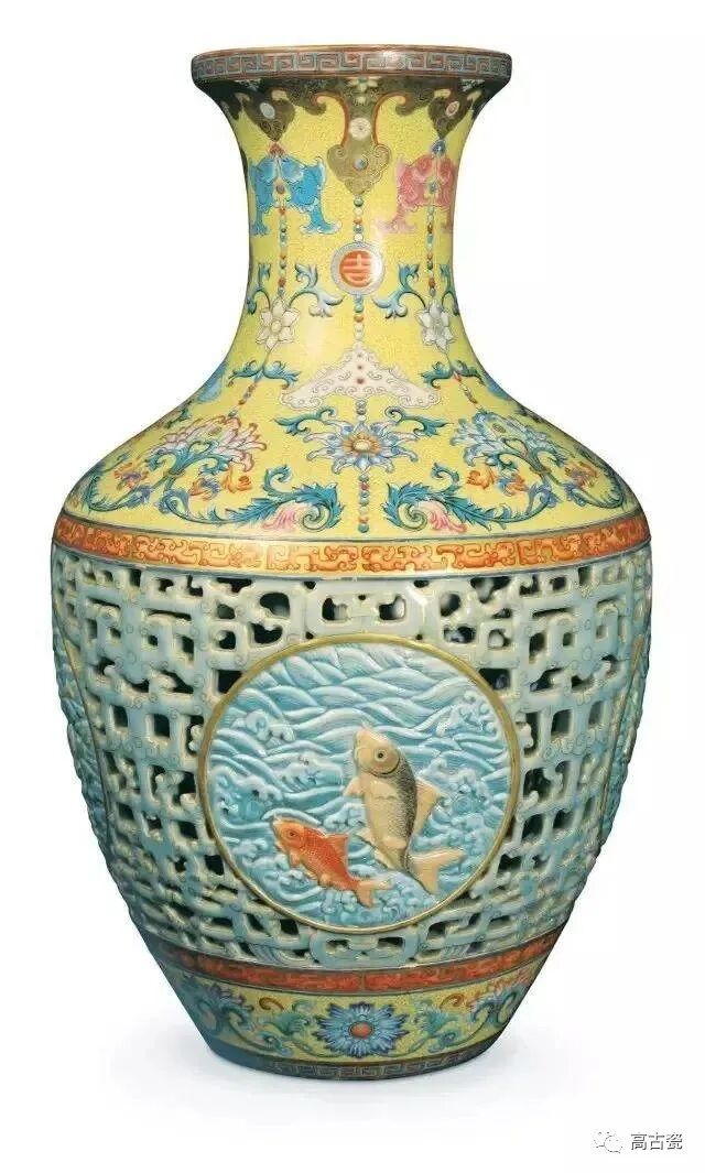 NO.10 清乾隆 洋彩黄地粉青透龙夹层吉庆有余玲珑尊