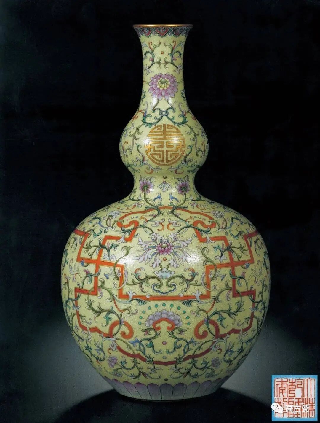 NO.2 清乾隆 浅黄地洋彩锦上添花「万寿连延」图长颈葫芦瓶