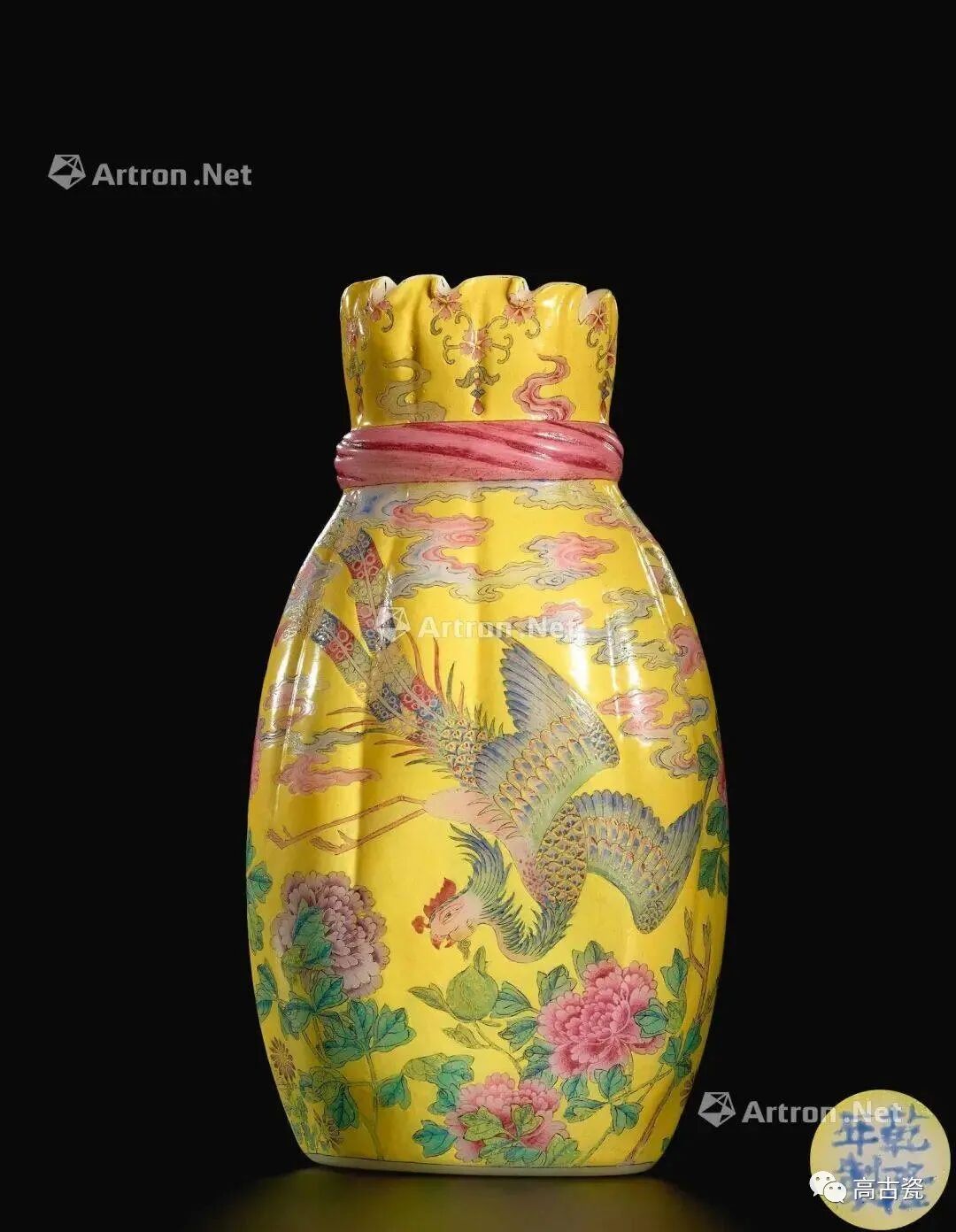 NO.4 清乾隆 料胎黄地画珐琅凤舞牡丹包袱瓶