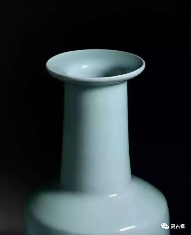瓶盤口,長頸漸寬,折肩,直筒腹,淺圈足。內外施粉青釉,釉汁厚潤如脂,幽微素淨
