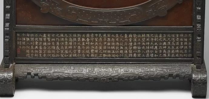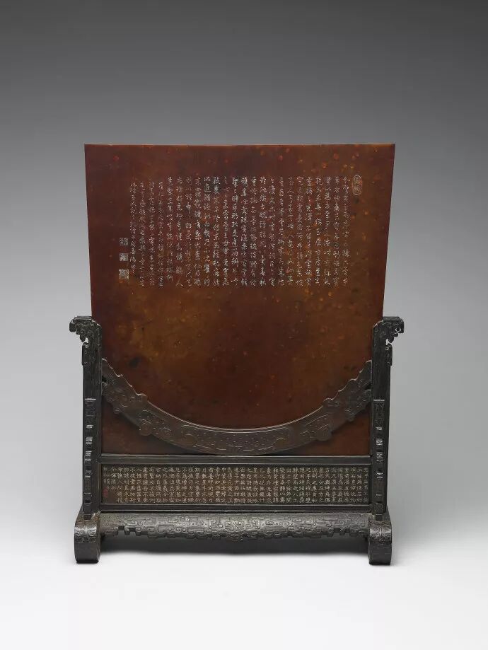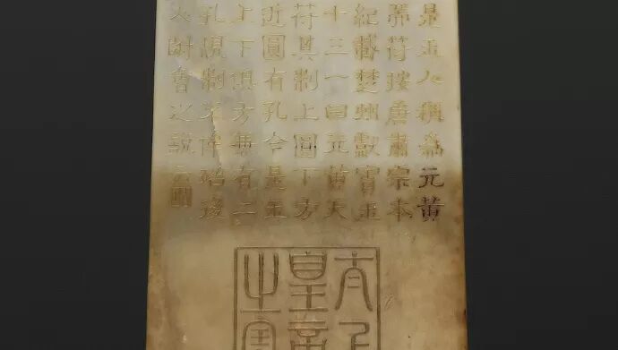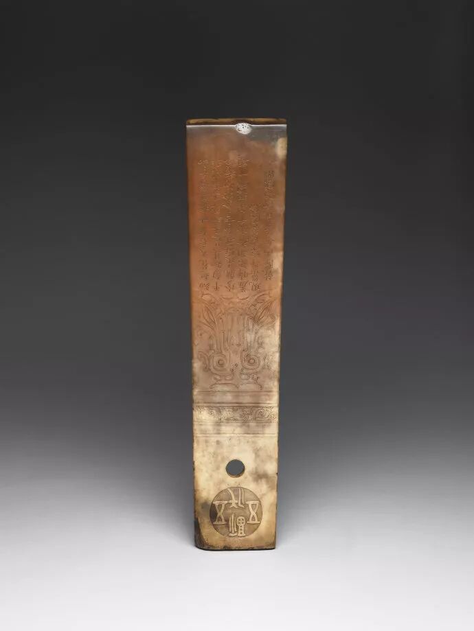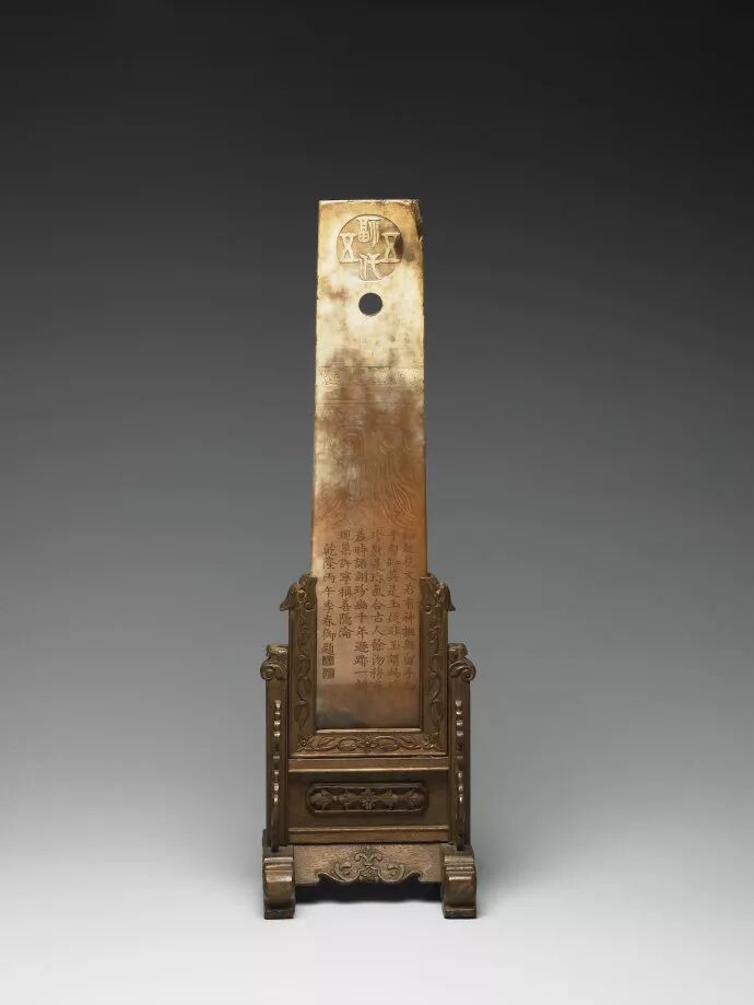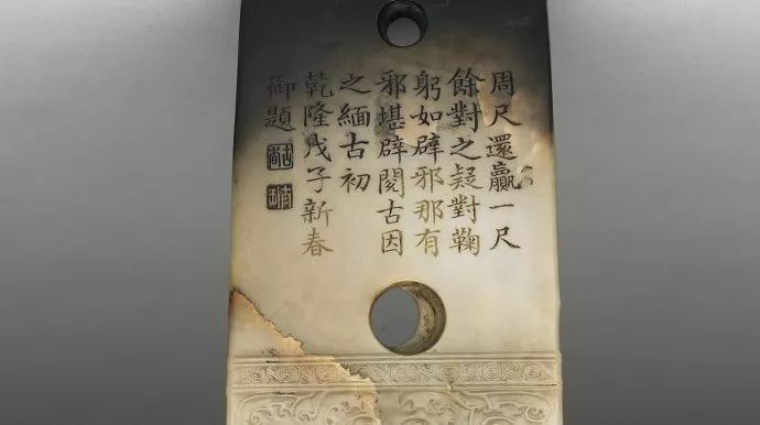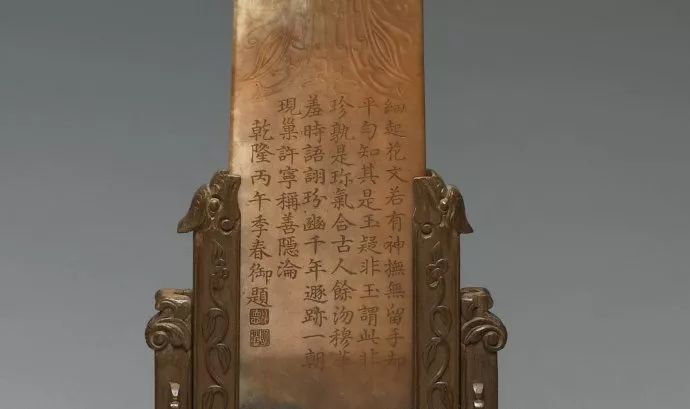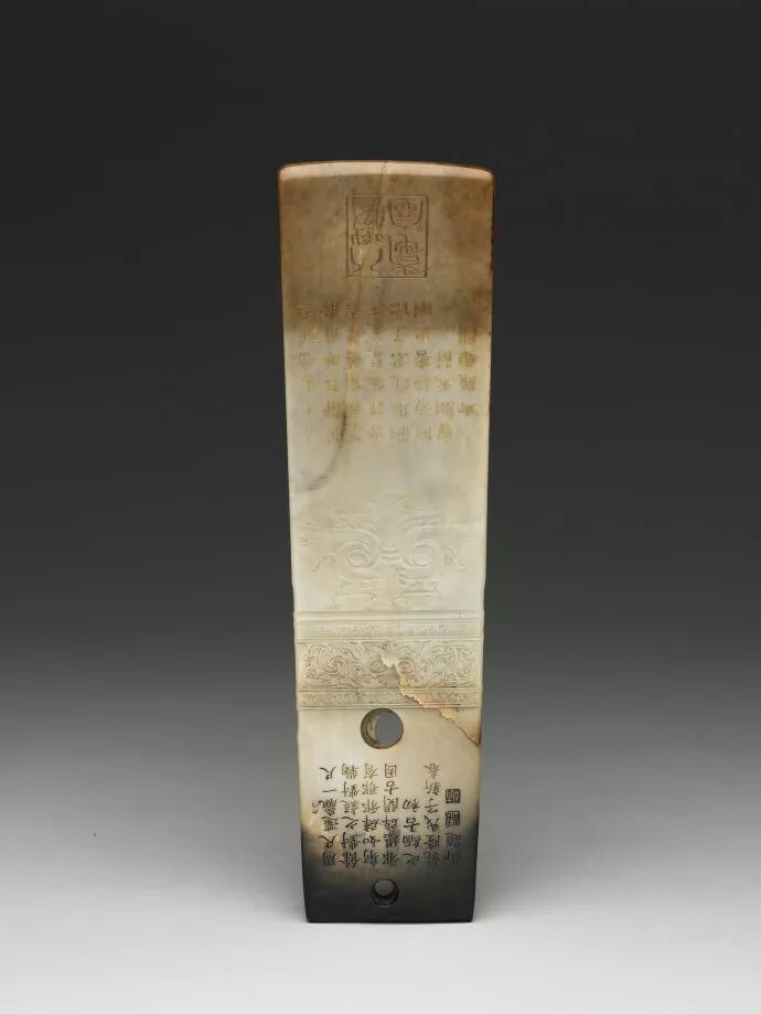 推测为新石器时期大玉刀的半成品,待到乾隆朝经宫廷作房重新修整 ,编号“吕”字,表示曾陈设于养心殿。其玉版的重要性,故宫表述 如下:玉玉版原為光素,清高宗時加琢御製詩二首。由詩看來,高宗認為此玉版「嶷嶷逾尺」、「閱幾滄桑」、「色得元黃之正」、「質具圭璋之素」,其堂皇、長遠、正統、禮制的特質,完全符合帝王彰顯皇權所需的象徵意義。一度自信如乾隆皇帝者,面對這件稀珍瑰寶也曾「自審臨池腕力醜」,因「虞壞其質」而未將十一年春所寫的詩刻於器表,僅是囑咐學士張若靄代為書鐫於紫檀木架上,可見對此收藏的萬般寶愛。不過八年後,即乾隆十九年(1754),高宗又為之作詩詠贊,且乘興親自書寫前後二詩交予玉匠鐫刻,玉版遂不復素淨的原貌版原為光素,清高宗時加琢御製詩二首。由詩看來,高宗認為此玉版「嶷嶷逾尺」、「閱幾滄桑」、「![台北故宫:再现几件永恒经典的上古之玉]()