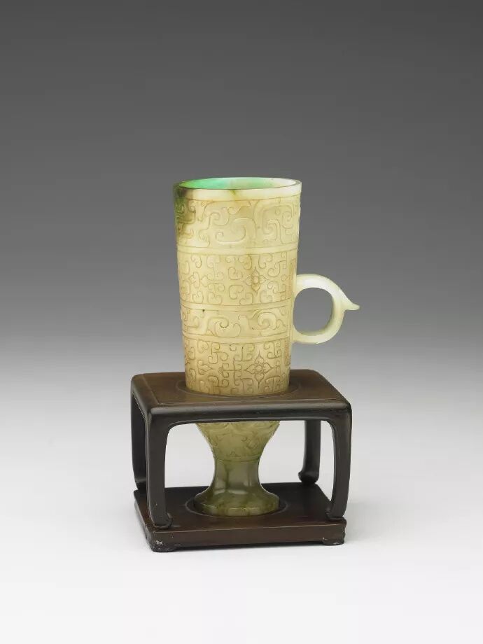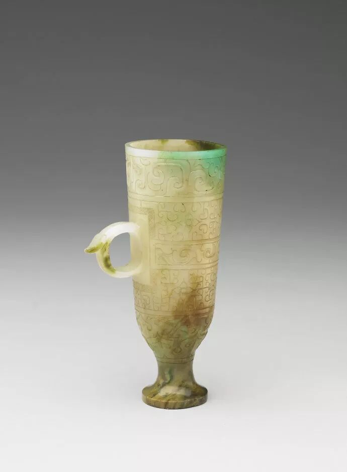 这件娟丽秀雅的玉杯,是以精润半透明的青白色玉雕琢而成。杯体略呈细长的圆锥体,配以高足与单柄。自口缘至高足上,以五条横饰带围绕器表,饰带中浅浮雕各式云纹、四瓣叶纹等。杯体多处因接触铜锈而沁成蓝绿色,其中以口缘处的沁色较为偏蓝,这或是因为所接触的铜器,是用蓝铜矿中提炼出铜来铸造之故。汉代贵族特别重视玉制的容器,并用予承接天露,感应天地,因而能成仙得道。![台北故宫:再现几件永恒经典的上古之玉]()