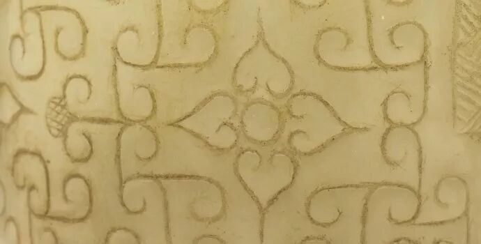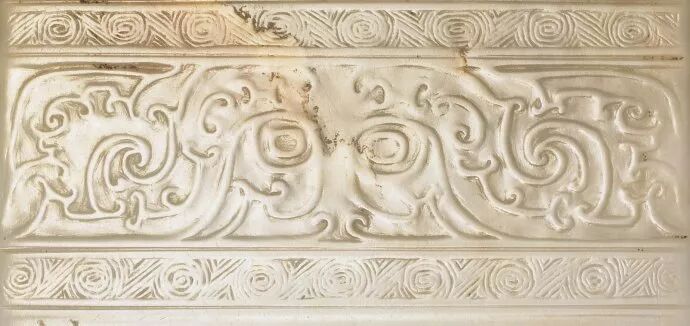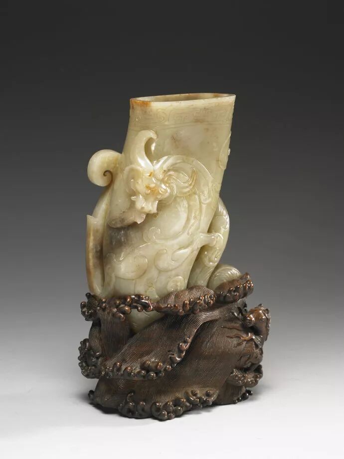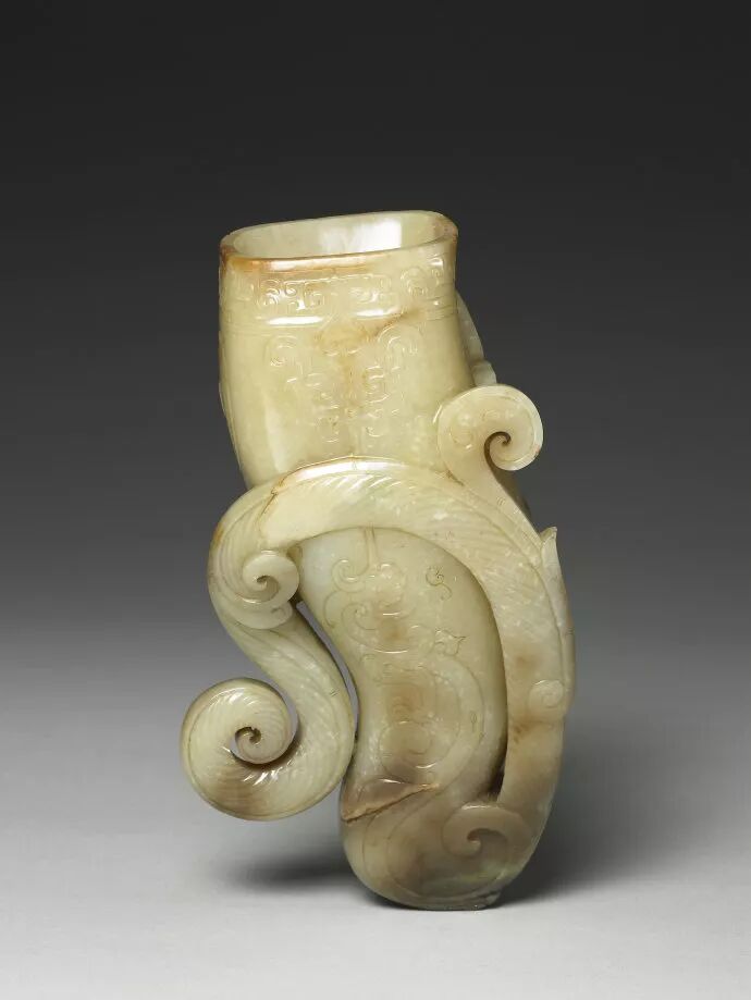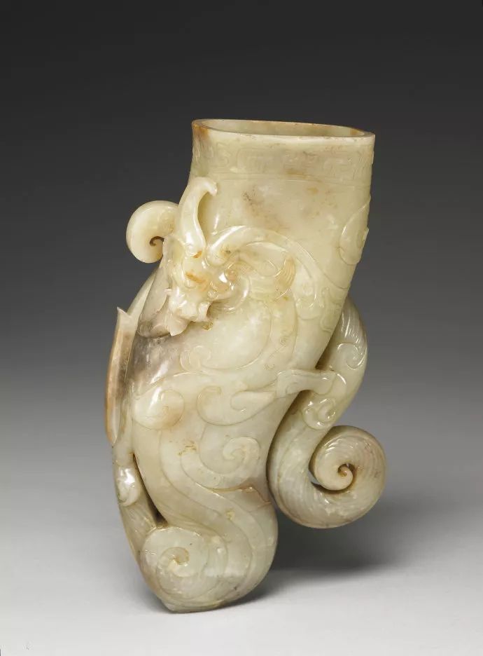 青白玉质,全器作角杯型,器表浮雕一龙蟠绕,龙体矫健有力地凸显了汉代工艺的雄浑气势。角杯作为饮器,是汉代与中亚文化交流的产物。