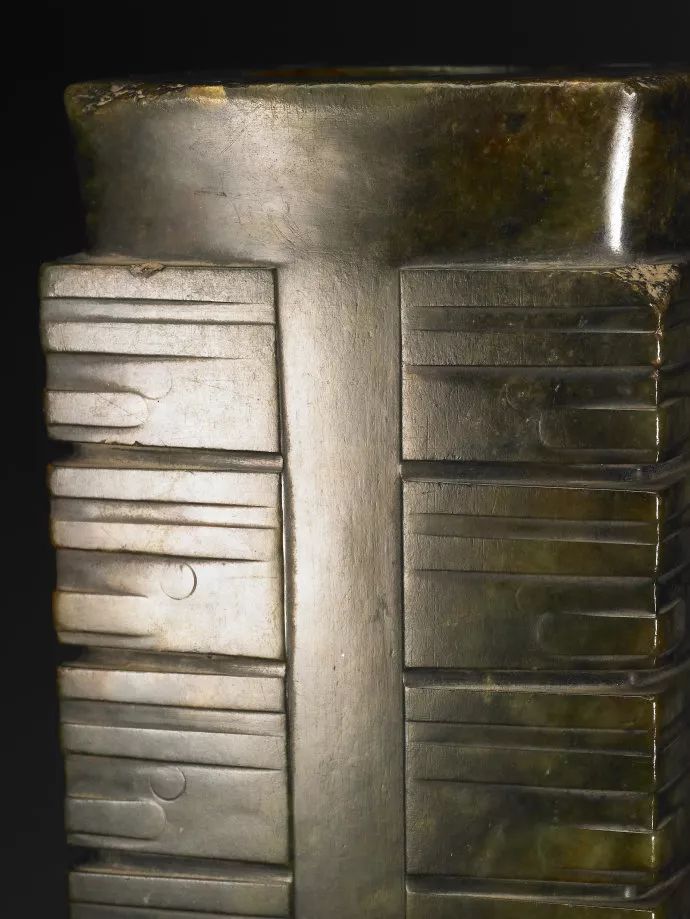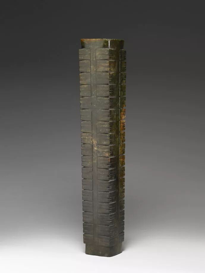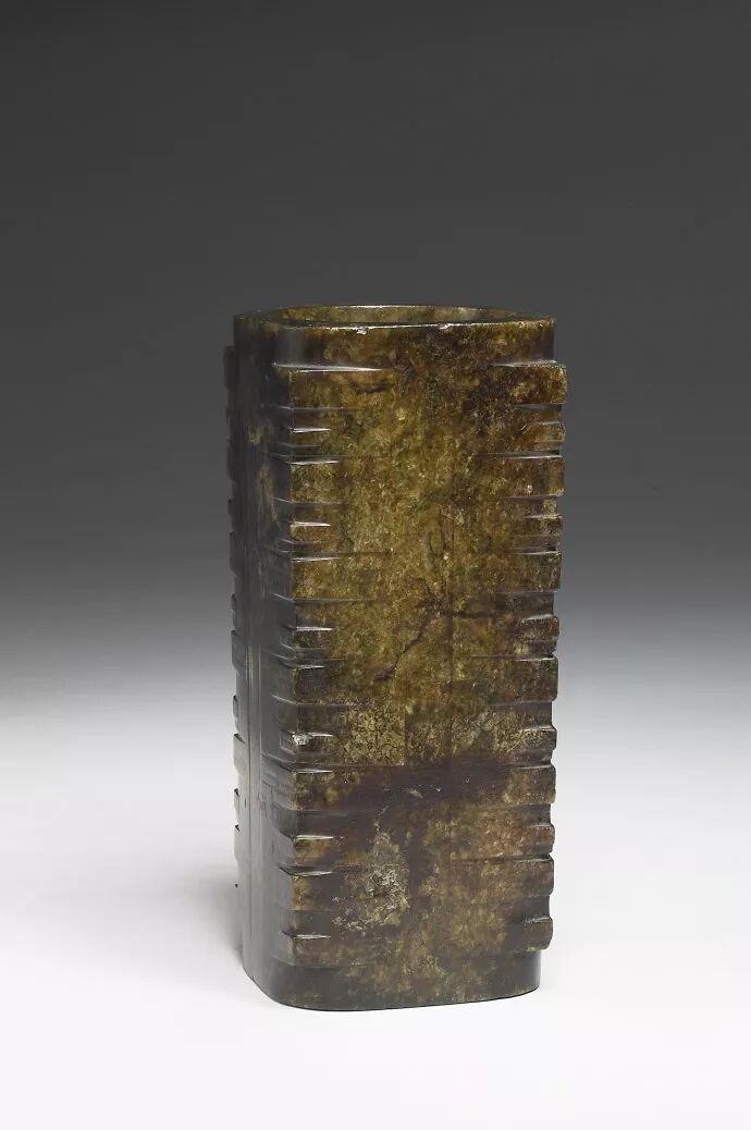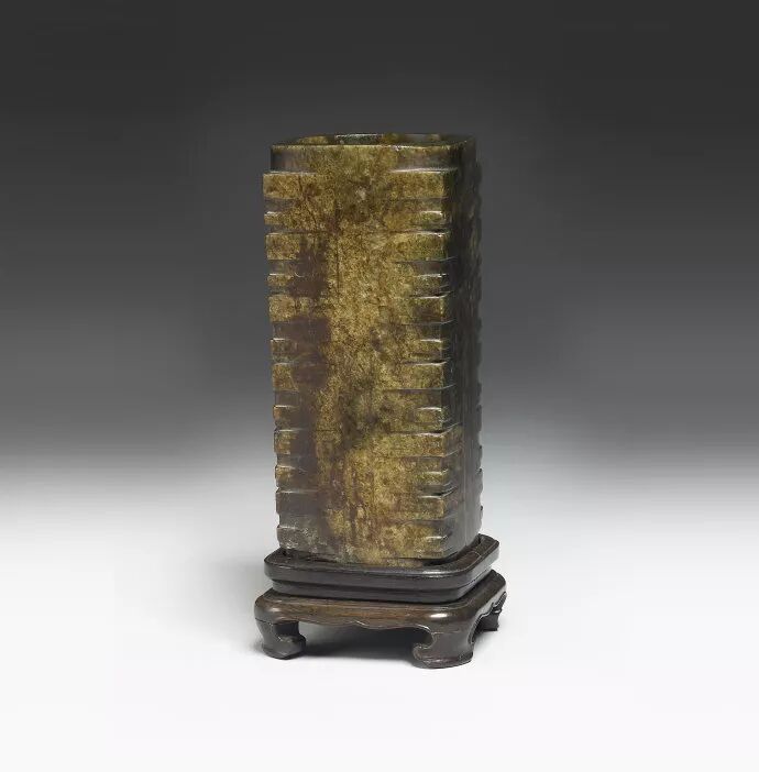 这件保持原貌风格的大玉琮是在十九世纪入藏清宫的,它以深碧绿泛浅褚斑闪玉琢成。![台北故宫:再现几件永恒经典的上古之玉]()