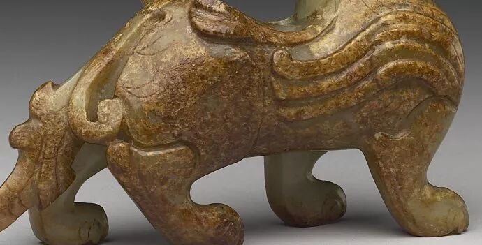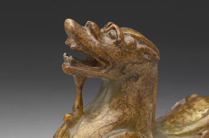 本件带翼神兽,虎首,张口露齿,带须,鬃毛卷曲,长尾,后腿弯曲跪于地,其形象更如“如虎添翼”,创造出了饱满的视觉张力,当为汉代圆雕神兽的精品。![台北故宫:再现几件永恒经典的上古之玉]()