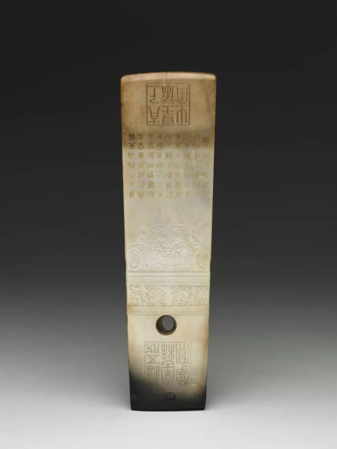 此件人面纹圭质感细腻,从型制与纹饰分析,应是龙山文化黄河中下游的玉礼器。玉圭三千年后流入清宫,乾隆帝分别于38岁和58岁时赋诗二首,可见乾隆对此圭的钟爱。![台北故宫:再现几件永恒经典的上古之玉]()