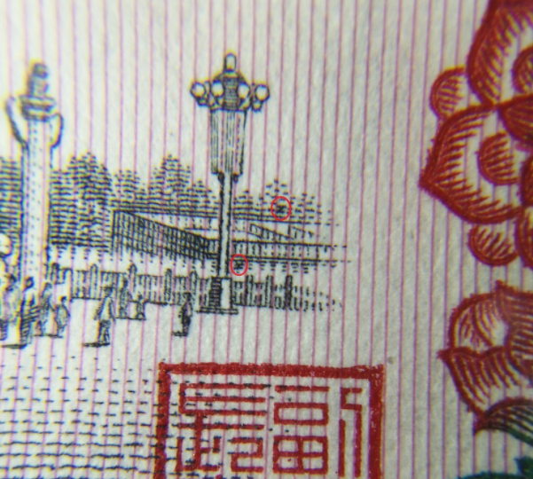 1、胶版背棕:兰字二三罗马,红二罗胶,红三罗胶四种在正面图案中大门右侧五与六栏杆上有英文字母"J",六与第七报栏杆之间的上端有一英文字母“A”,"A"下是一个小"+"(注意,是小的"+"), 左边第二个人手腕上有“中”字暗记。