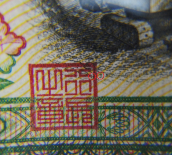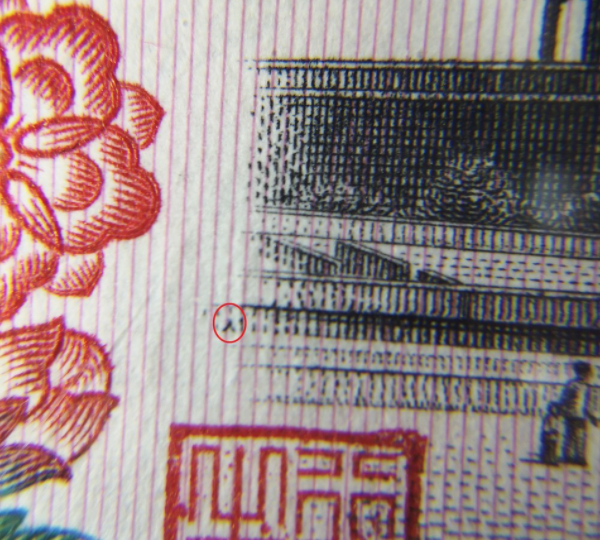大团结拾圆背面天安门右侧华灯柱子右有"工";背面天安门右侧华灯右上有"Z";背面天安门左端边缘处有"人"。