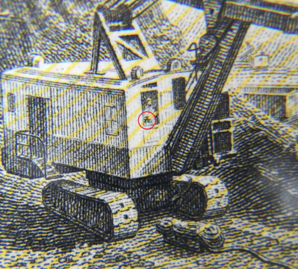 贰元券背面石油钻井架下,草丝中藏有一个“2”字和"R"。