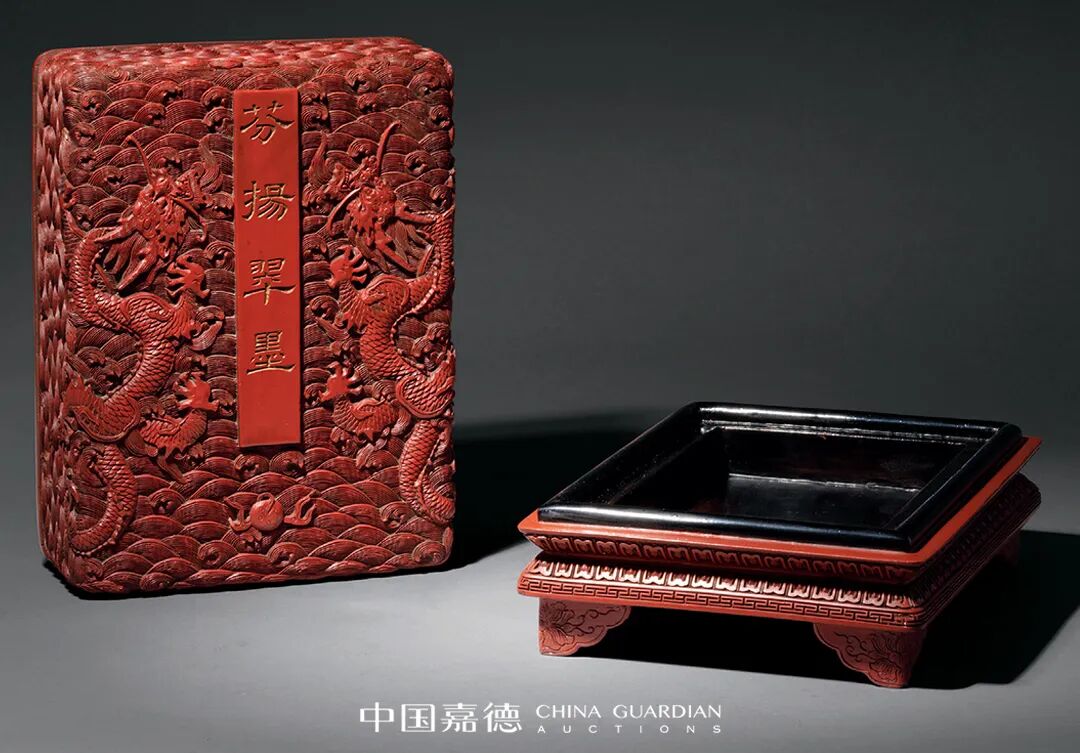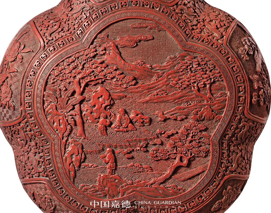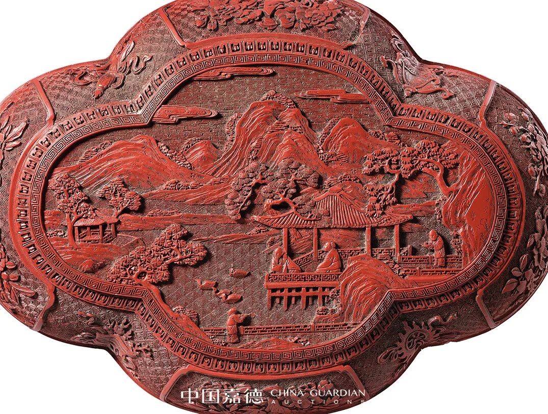 清朝乾隆时期的雕漆技法更是集前代之大成,融会了明代的风格特点并有创新和发展。据载,原在清宫造办处“牙作”当差的南方牙匠,乾隆时命他们雕刻漆器,他们自然追求雕牙般的精细纤巧。乾隆时期大量的雕漆亦交由苏州制作,苏州匠人则将雕刻竹木逸品奇俏清新、气韵生动的风格带到雕漆中来。在这两种因素的作用下,乾隆时期雕漆的技法形成了新的风格,此现象通过本品即可见一斑。