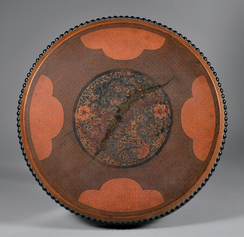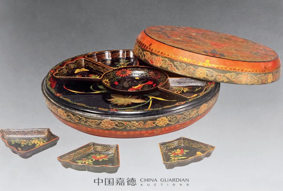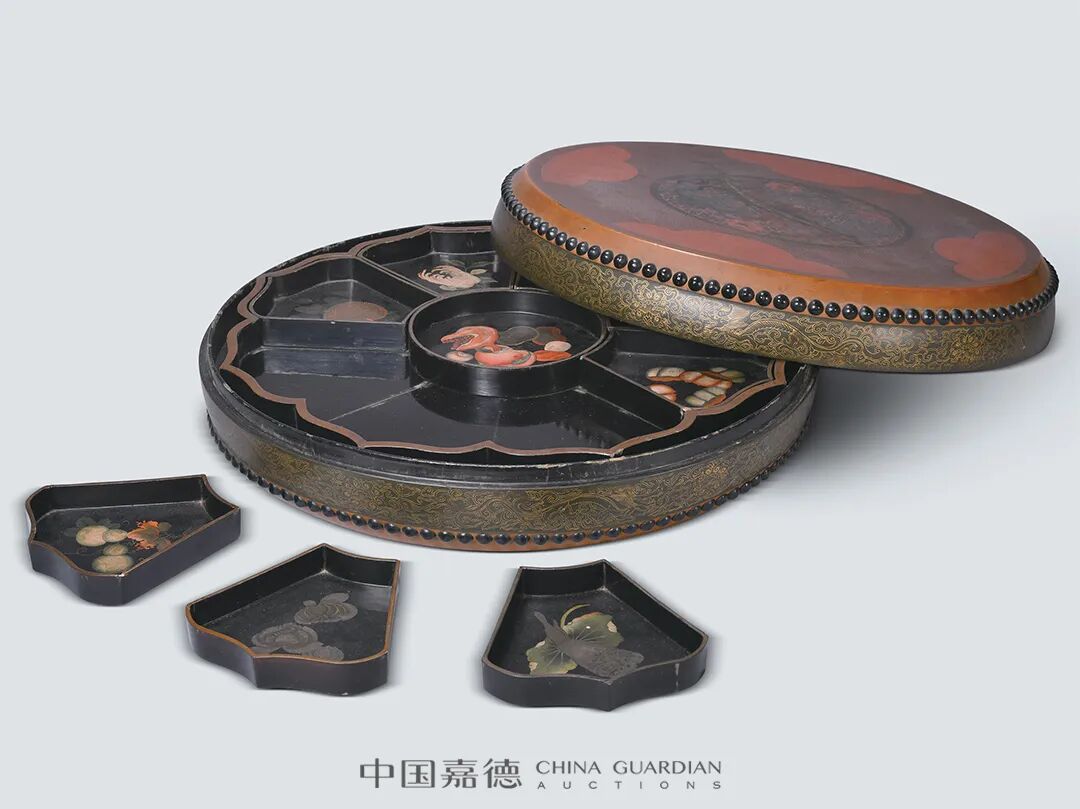 本品盖盒体量硕大,圆正端庄,以鼓为范本化裁而来,造型新颖,别出心裁。盒内及底髹黑漆,外壁通体以戗金填彩工艺装饰,盖面中央圆形开光雕填穿花龙纹,其龙形神武,张牙舞爪,气度不凡,龙身下方雕以缠枝花纹,衬托出主体穿花龙纹大派气度的威严和力量感。盒盖、器壁各饰黑漆凸起鼓钉一周。盒内附黑漆花形屉,盛描彩漆瓜果纹攒盒九个,整器画面构图繁而不乱,井然有序,以红、绿亮色漆为主色调填饰,年代既久,漆色多有脱落,漆面包浆厚重,古朴雅致,沉穆中透露出华美之感。本品采用漆器工艺中较为少见的戗金填彩手法制作而成,工艺复杂,在明清两代的漆器生产中均极为少见。