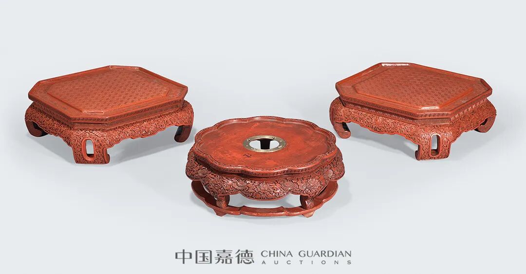 本品剔红缠枝花卉纹器座一组三件,其一,剔红花形座,整器造型匀称,雕工繁缛无匹,剔红悦目的色泽可完美的与这种华丽的风格形成映衬,从而达到最佳之艺术效果。其二,剔红倭角方形器座一对,造型于方直中见圆曲,雕工密而不乱,极见功力,为工、艺、材、美俱佳之作。