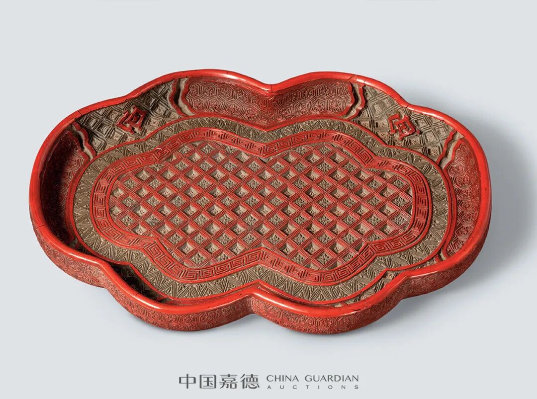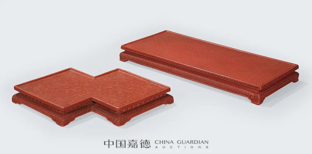 本品剔红锦地纹器座一组两件,精美细致,陈于案几上,用以盛放笔筒、印盒、小器玩等物品设,典雅而文风凛然。二者造型规矩,包浆润泽,装饰技法娴熟,髹漆厚薄适中,漆质坚实,漆色朱红悦目,用刀灵活多变,剔刀精细,锋芒毕露,显示出典型的清中期漆作工艺特征。