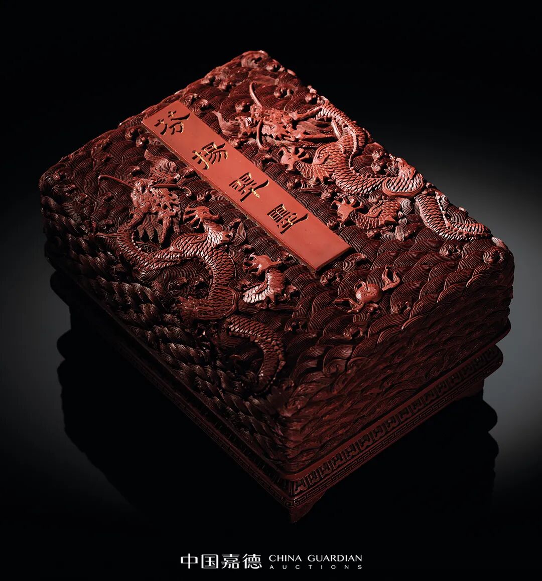 此件剔红海水龙纹“芬扬翠墨”盒工艺精湛,是乾隆时期造办处制作的御用之器。盖面之上双龙之间长方形漆板刻有“芬扬翠墨”四字楷书,字体大气工整。浮雕中的游龙带五爪,是帝王的象征,常见于御制器物,盒壁饰以海水纹作为锦地。此盒刀法精密,且刀工处理手法为乾隆一朝所独创,极具时代特征。海水龙纹为清代宫廷造办处器物的经典装饰纹饰,以龙与海水组成,故而得名,瓷器上多见。本品汲取了前代及同时期纹饰雕刻的精华,利用工艺将海水龙的威猛矫健立体地表现出来,鳞片争张,云水翻腾,形神兼备实在是精品,又是帝王礼佛之器,其珍贵自不待言。