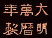此件剔红荔枝纹香盒形制扁圆,盈手可握,盒盖及盒壁均龟背锦地之上各雕荔枝一株,枝干柔韧多姿,大叶翻卷肥厚,层层叠叠,间隙处理得当,并无堆砌繁琐之感,叶脉刻画亦毫不含糊,所饰荔枝大小不一,虚掩于叶间,荔枝上以不同锦地将多颗果实区别开来。圈足内剔刻填金“大明万历年制”六字二行楷书刻款。整体雕漆技法娴熟,刀锋隐起圆润,细节处理毫不含糊,髹漆肥厚,极为难得。