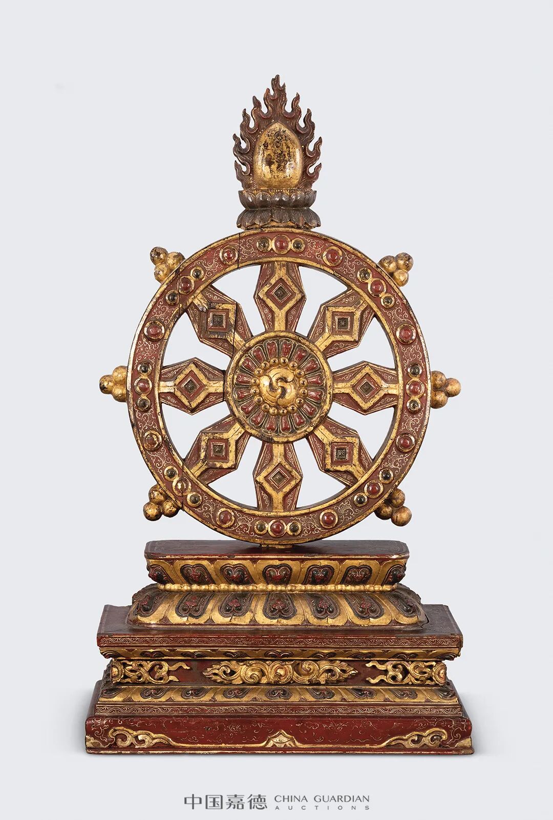 清初帝王深谙政治统御手段,或临之以皇权,凭借雄厚武力扩大其版图;或怀柔以宗教,包容尊重各种信仰与传统,以博取汉族及边疆各族的向心力。因此为蒙藏人民所信奉的博大精深的藏传佛教逐步代替萨满信仰成为清代宫廷宗教。流传至今的藏传佛教文物除了文书档案,佛经,绘画之外尚有佛像,佛塔,法器,供具等等。参照故宫博物院的收藏记载而言,这些藏传佛教供器,原本多放置于清宫中的慈宁宫,养心殿,雨花阁,中正殿,亦有供奉于承德避暑山庄和沈阳盛京故宫。本件漆金法轮,造型相当少见,宝相庄严,漆金更是增加皇家富贵气质和金碧辉煌的艺术效果,应为典型宫廷法器,属供养类,一般常置于佛前供案上,以示观想。