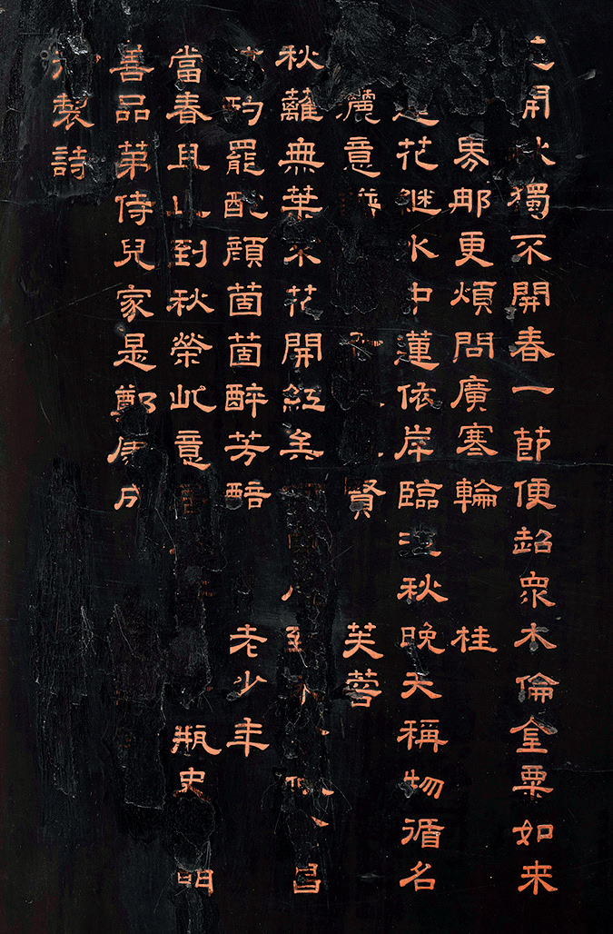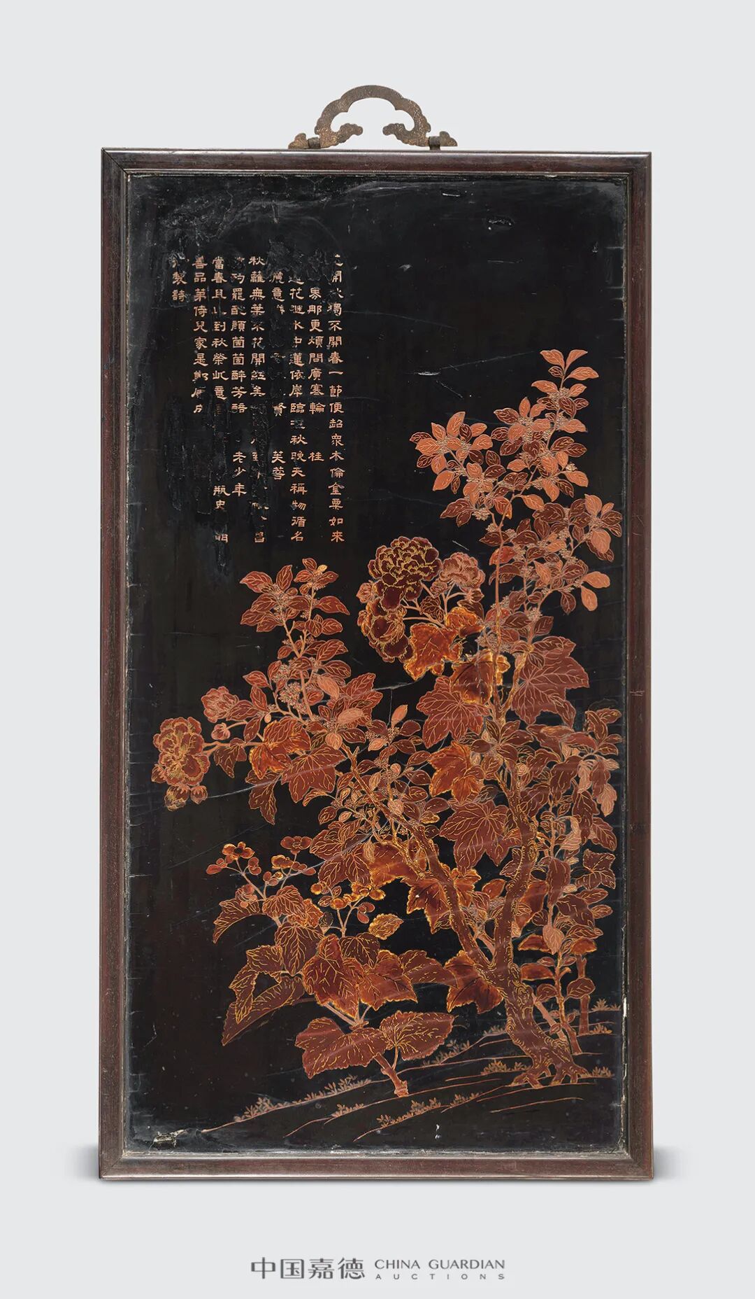 挂屏整体精巧端庄,黑漆地上以识文描金工艺绘制芙蓉、桂花等数株,色彩妍丽,姿态婀娜。左上方留白处题写御题诗文,其内容常与所绘纹饰题材相呼应,由于历经几百件的传承,挂屏上御题诗文局部缺失,但整体面貌依旧不失当时风采。整器装饰简约而庄重,从挂屏的艺术风格看,显然是清乾隆清宫造办处工匠的杰作,是为宫廷陈设重器。