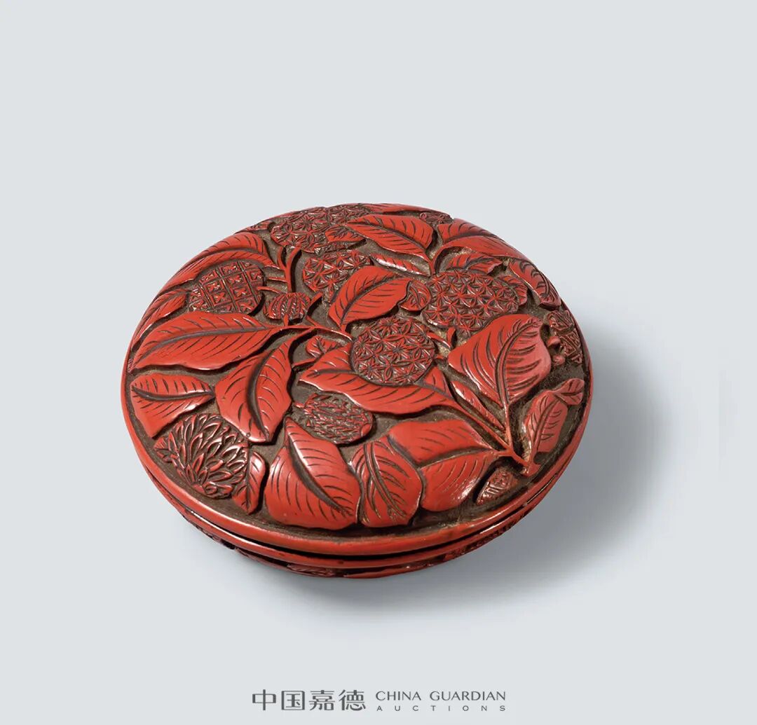 明初之时是中国漆器发展史上的一个高峰,这一时期的剔红器物漆质精纯,雕刻技艺精湛,纹饰题材丰富,其中以花果纹最为多见,尤其是盒、盘器物之上尤喜以花卉为饰,类似本品之通身荔枝纹饰源自永乐宫廷制品,因荔枝利及财富,寓意极好,而成为之后的经典装饰题材,漆器、玉器、瓷器之上皆有使用。