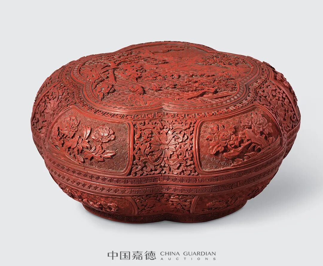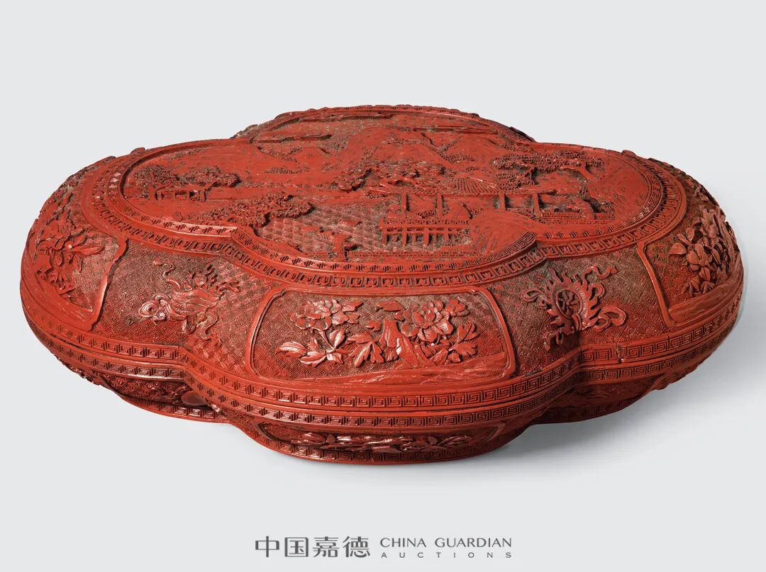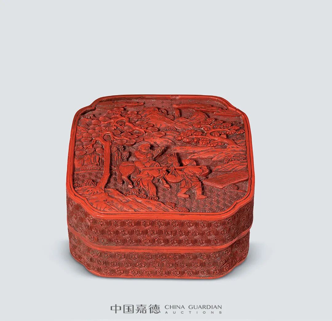 盒木胎,作四曲海棠形制,造型端庄饱满,平顶弧壁。盒内及底髹黑漆,外壁以剔红工艺装饰,盖顶随形开光,开光内分饰“天、地、水”三种锦文地,以示远近不同空间,锦地上压雕山石庭院高士人物图,整器髹漆肥厚,漆色红艳,富丽典雅,雕刻工艺精湛,刀法流畅,画面构图饱满不露地,为典型的清乾隆时期漆雕装饰手法,如此工艺纹饰,必出自清宫造办处漆器作坊。