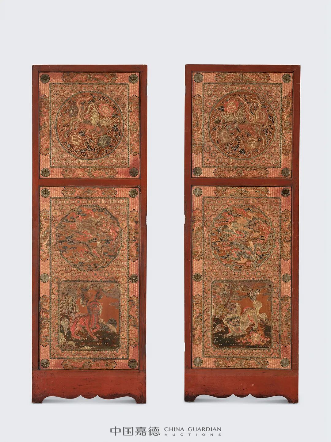 屏风采用漆器工艺中较为少见的彩漆戗金手法制作而成,工艺复杂,在明清两代的漆器生产中均极为少见。此对戗金填彩龙凤纹屏风,木胎髹漆攒框,工艺复杂精巧,造型规矩端庄,外壁以朱红漆为地,通体戗金填彩纹饰,满绘团画锦地,上半部主体饰凤穿牡丹纹饰,下饰云龙戏珠、狮子绣球等纹饰,寓意吉平安、寿山福海。周围装饰内容均为传统的吉祥图案,纹理清晰,填彩戗金细腻。色彩为红、黄、赭、绿、黑等色的组合,沉稳和谐,器表磨制精细,具有显着的宫廷特色。全器缜密的构思,繁密细致的纹饰,高超的工艺,予人呈现庄重华美之感,体现出作品的高贵典雅,亦体现出古代宫廷家具的独特气魄与艺术风格。