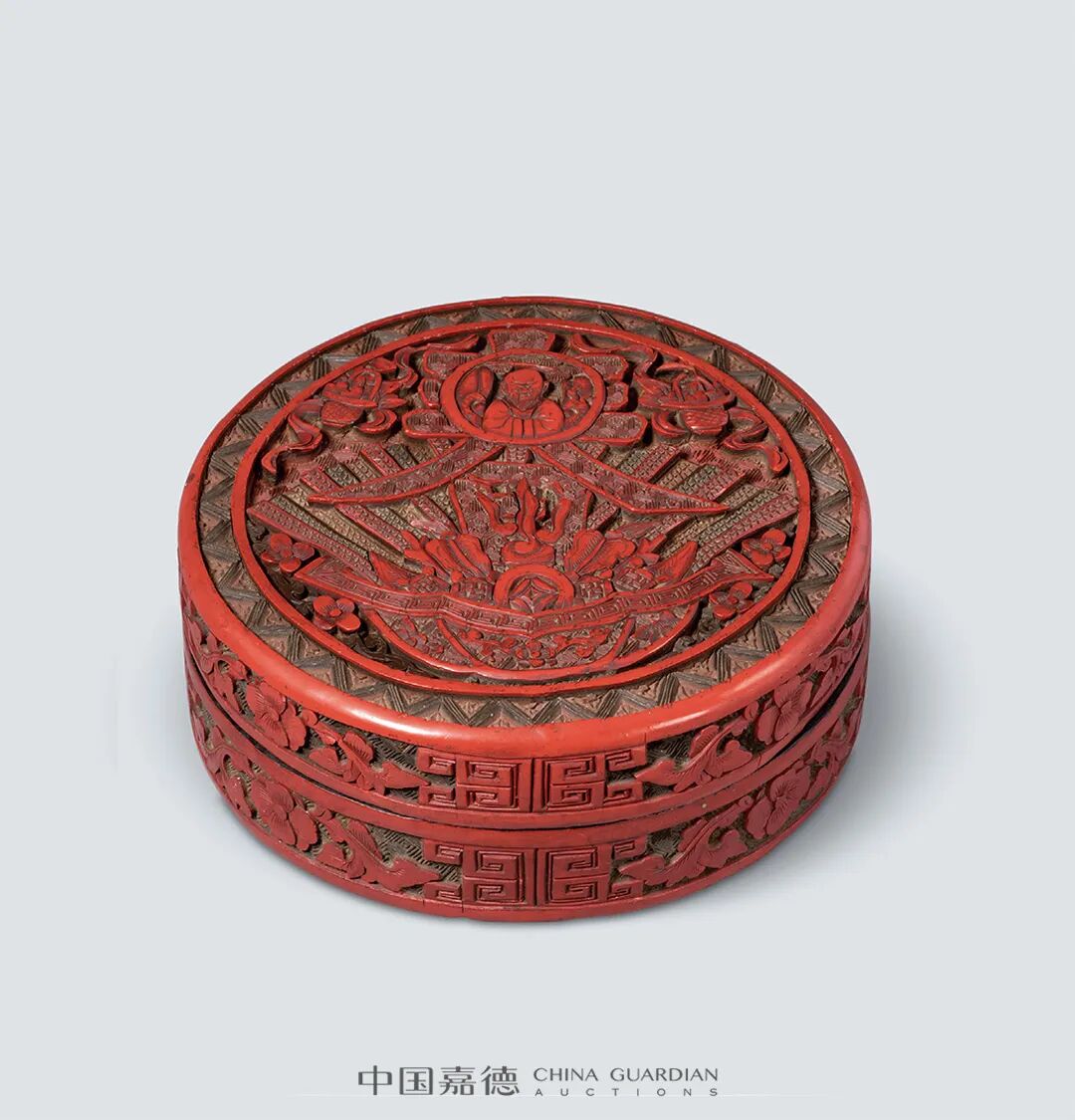 此盒呈扁圆形,器型规整。盒外饰以繁缛华丽的剔红工艺,盖盒图案完全承袭嘉靖朝,乾隆朝将之命名为“春寿宝盒”。“春”字带“万寿长春”的祈愿,“宝”字则代表聚宝盆上的宝物,包括金钱、锭、珠宝、珊瑚、珍珠等珍贵物品。因“春”字具有一年复始、万物更新之意,故可象征长寿和新生,为明清时期经典装饰,甚为皇家宝爱,百年不衰。