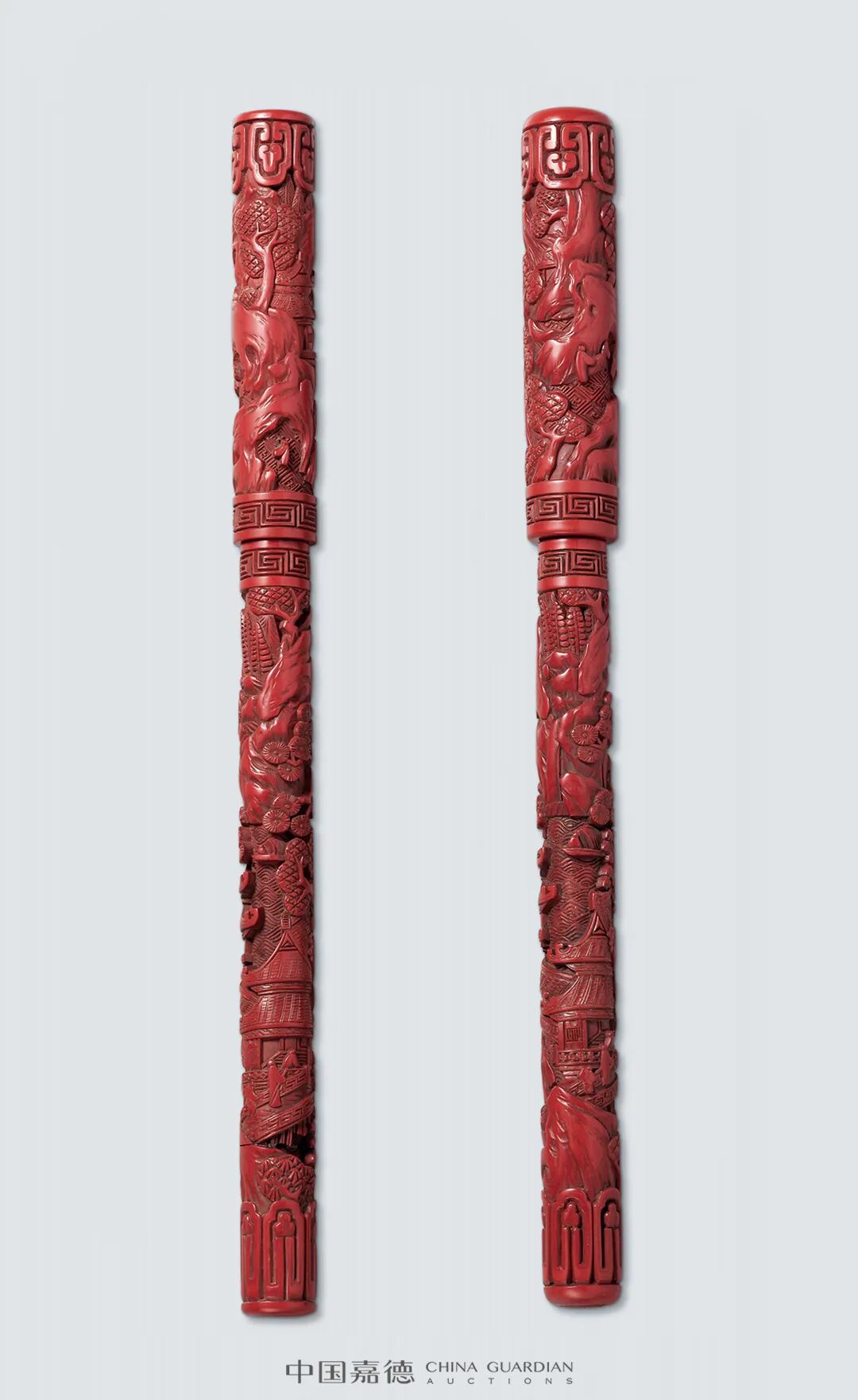 笔身筒形,形体修长,通体朱漆为地,剔红雕刻纹饰,漆色朱红,呈沉郁隽雅之态,光泽莹润,显含蓄华美之风。整器造型规整,纹饰构图疏密有致,刻划精细入微,磨工圆润,纹饰意境深远古雅,极见雕刻功力,时代特征鲜明,且成对保存至今,实属不易。虽器形小巧,但做工精致,可堪案前赏玩,呈现文人气息同时,又流出剔红工艺高贵华美风貌,当为鉴藏家珍视。