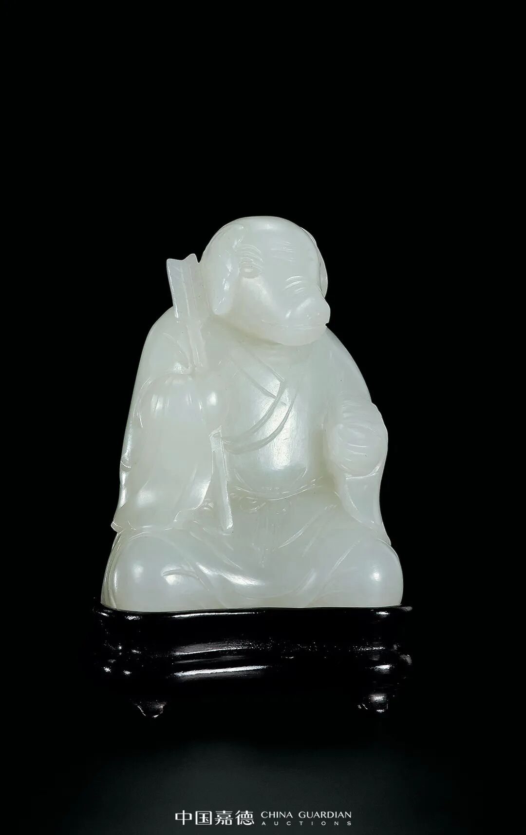 由此,也可了解到本品应由十二件生肖为一组,以拟人化的表现手法,雕坐姿各异的兽首人身十二属相,并手持各具不同象征意义的法宝,即所谓十二辰像。而这些玉雕十二辰像多制作于乾隆年间,并存世于公立博物馆及少数私人藏家中,如北京故宫博物院藏有此类成套的玉雕十二生肖像。据钱九如先生《万年甲子盒》一文中阐述,玉十二生肖像存放于紫檀盒中,环坐围绕一碧玉方盒而置。紫檀盒的罩盖通体刻字,中心落“万年甲子”四字,十二地支环绕一周,最外两周百寿字。罩盖的十二面墙和盖内均刻阴文填金御制诗并序,御制诗题为《效仇远十二辰体咏金川事》,诗作于乾隆乙未(1775年)。乾隆皇帝曾在《永乐大典》散篇中元人仇远《金渊集》内发现有十二辰体诗,颇为欣赏,既而仿效而作此诗。乾隆皇帝一生文治武功,自称“十全老人”,歌颂其十全武功,其中攻克大小金川之战即为其中之一,由此可知,此套玉雕十二生肖万年甲子应为纪念金川之役大捷而造。
