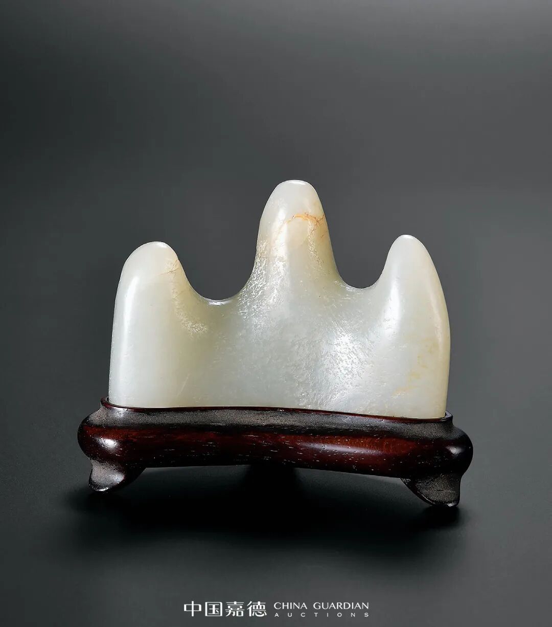 笔架是书斋中不可或缺的一件文房用器,清乾隆白玉沁色山形笔架(lot 2519)呈山字形,线条流畅。器虽不大,然文气十足,古雅朴实,既是笔架山,又可兼做纸镇之用。笔架亦称笔格,为置笔的文房用具。南北朝时就已有笔架一词,唐杜甫 《题柏大兄弟山居屋壁》诗:“笔架沾窗雨,书签映隙曛。”宋鲁应龙 《闲窗括异志》:“远峰列如笔架”。足见唐宋时期,笔架已成为文房必备之物。