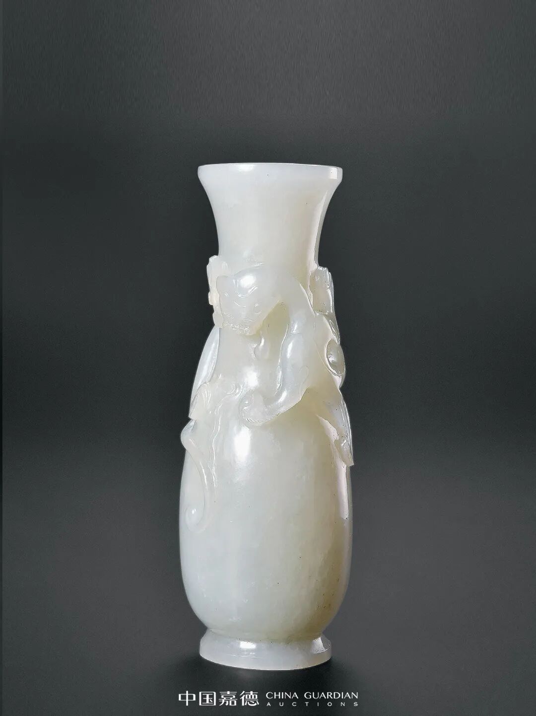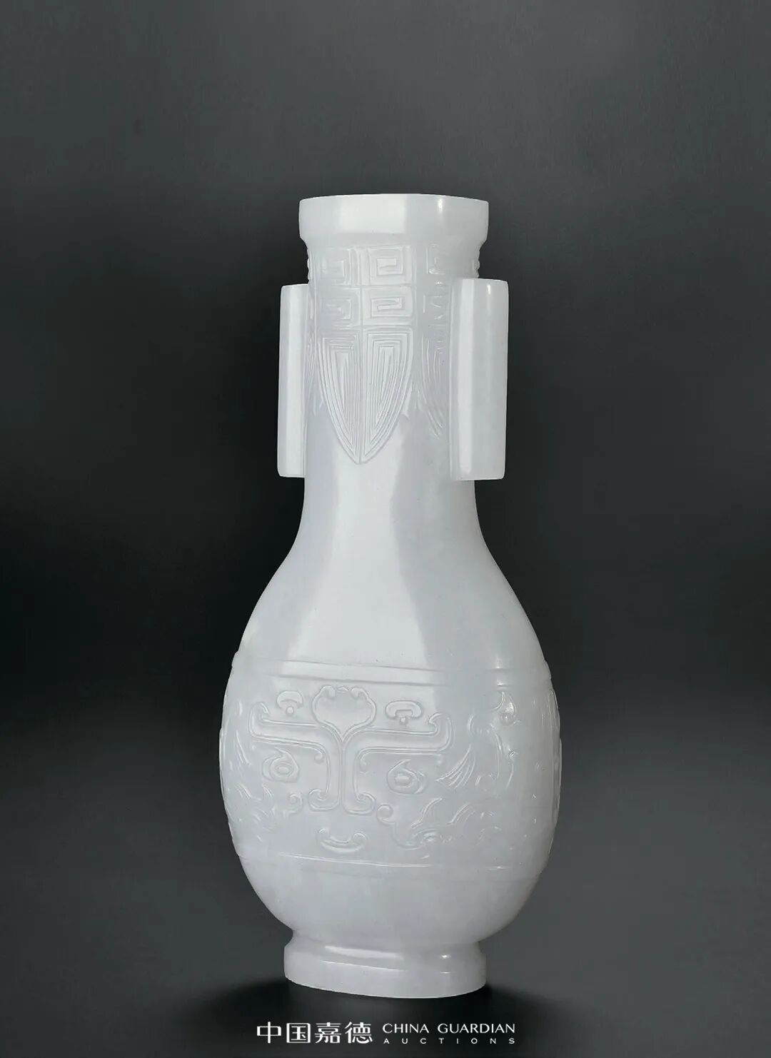 清中期青白玉雕饕餮纹双耳小瓶(lot2527)本品造型、纹样均化裁商周青铜器之礼器而来,主体纹饰于腹部刻饕餮纹,纹饰刻划精细、规矩,刀法精准,小器大样。